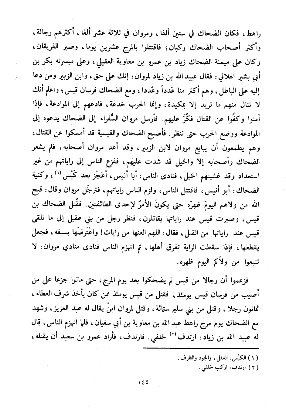 راهط، فكان الضحاك في ستين ألفا، ومروان في ثلاثة عشر ألفا، أكثرهم رجالة، وأكثر أصحاب الضحاك ركبان؛ فاقتتلوا بالمرج عشرين يوما، وصبر الفريقان، وكان على ميمنة الضحاك زياد بن عمرو بن معاوية العقيلي، وعلى ميسرته بكر بن أبي بشير الهلالي: فقال عبيد الله بن زياد لمروان: إنك على حق، وابن الزبير ومن دعا إليه على الباطل، وهم أكثر منا عددا وعددا، ومع الضحاك فرسان قيس؛ واعلم أنك لا تنال منهم ما تريد إلا بمكيدة، وإنما الحرب خدعة، فادعهم إلى الموادعة، فإذا أمنوا وكفّوا عن القتال فكرّ عليهم. فأرسل مروان السّفراء إلى الضحاك يدعوه إلى الموادعة ووضع الحرب حتى ننظر. فأصبح الضحاك والقيسية قد أمسكوا عن القتال، وهم يطمعون أن يبايع مروان لابن الزبير، وقد أعد مروان أصحابه، فلم يشعر الضحاك وأصحابه إلا والخيل قد شدت عليهم، ففزع الناس إلى راياتهم من غير استعداد وقد غشيتهم الخيل، فنادى الناس: أبا أنيس، أعجز بعد كيس «1» ، وكنية الضحاك: أبو أنيس، فاقتتل الناس، ولزم الناس راياتهم، فترجّل مروان وقال: قبح الله من ولاهم اليوم ظهره حتى يكون الأمر لإحدى الطائفتين. فقتل الضحاك بن قيس، وصبرت قيس عند راياتها يقاتلون، فنظر رجل من بني عقيل إلى ما تلقى قيس عند راياتها من القتل، فقال: اللهم العنها من رايات! واعترضها بسيفه، فجعل يقطعها، فإذا سقطت الراية تفرق أهلها، ثم انهزم الناس فنادى منادي مروان: لا تتبعوا من ولّاكم اليوم ظهره.