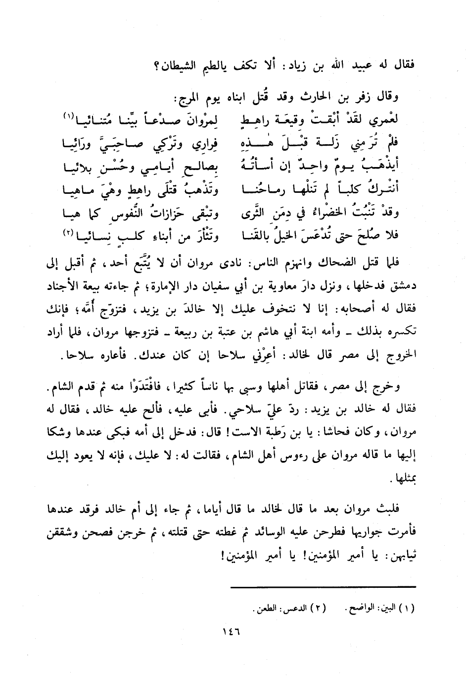 فقال له خالد بن يزيد: ردّ عليّ سلاحي. فأبى عليه، فألح عليه خالد، فقال له مروان، وكان فحاشا: يا بن رطبة الاست! قال: فدخل إلى أمه فبكى عندها وشكا إليها ما قاله مروان على رءوس أهل الشام، فقالت له: لا عليك، فإنه لا يعود إليك بمثلها.