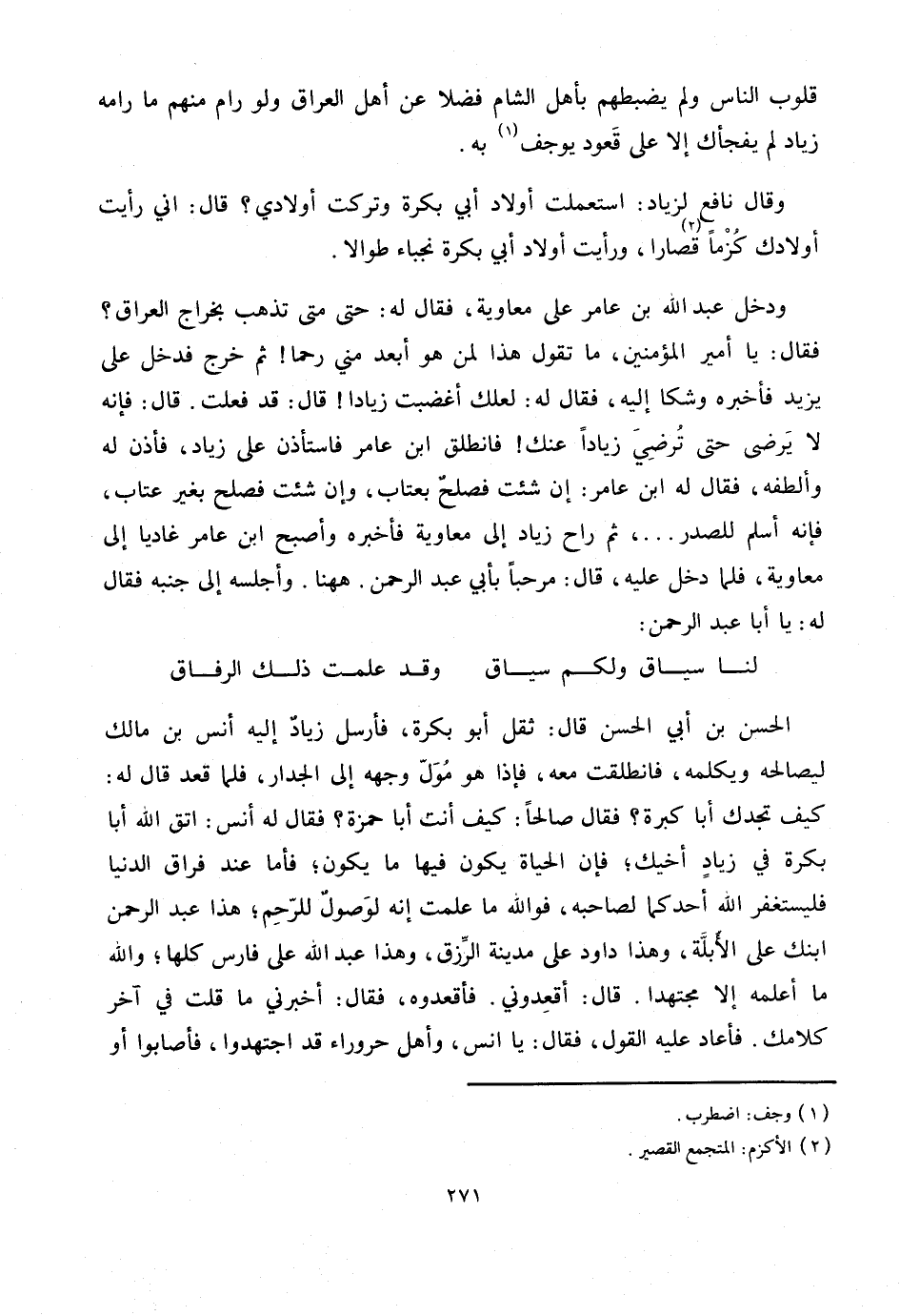 ودخل عبد الله بن عامر على معاوية، فقال له: حتى متى تذهب بخراج العراق؟