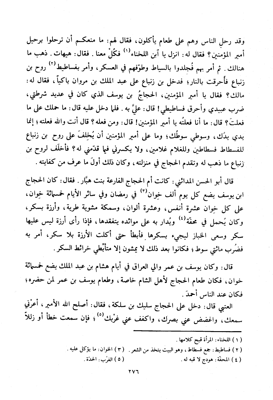 قال: وكان يوسف بن عمر والي العراق في أيام هشام بن عبد الملك يضع خمسمائة خوان، فكان طعام الحجاج لأهل الشام خاصة، وطعام يوسف بن عمر لمن حضره؛ فكان عند الناس أحمد.