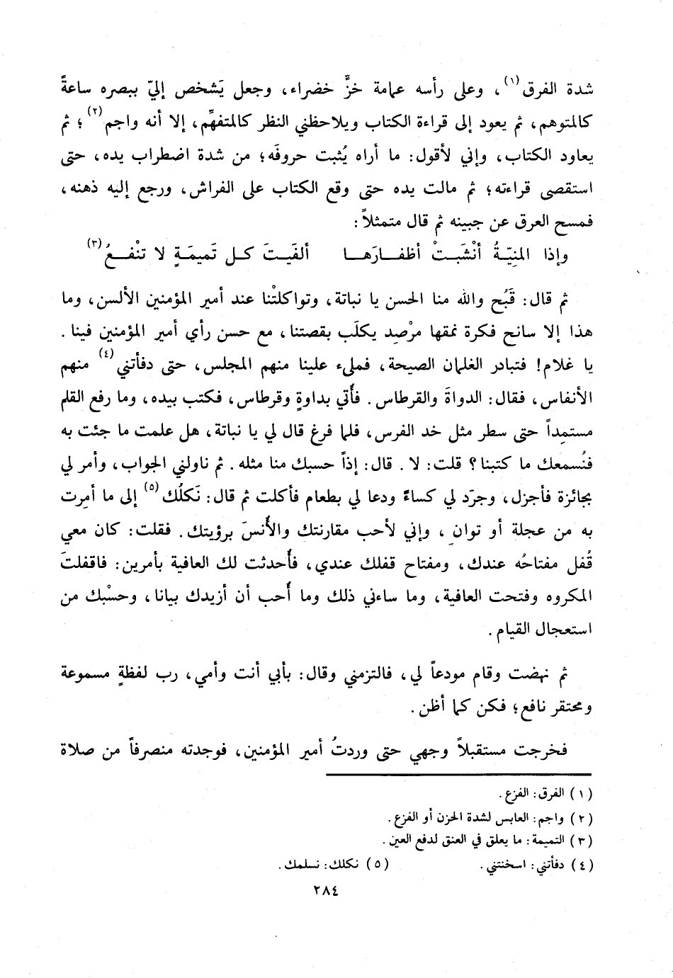 شدة الفرق «1» ، وعلى رأسه عمامة خزّ خضراء، وجعل يشخص إليّ ببصره ساعة كالمتوهم، ثم يعود إلى قراءة الكتاب ويلاحظني النظر كالمتفهّم، إلا أنه واجم «2» ؛ ثم يعاود الكتاب، وإني لأقول: ما أراه يثبت حروفه؛ من شدة اضطراب يده، حتى استقصى قراءته؛ ثم مالت يده حتى وقع الكتاب على الفراش، ورجع إليه ذهنه، فمسح العرق عن جبينه ثم قال متمثلا: