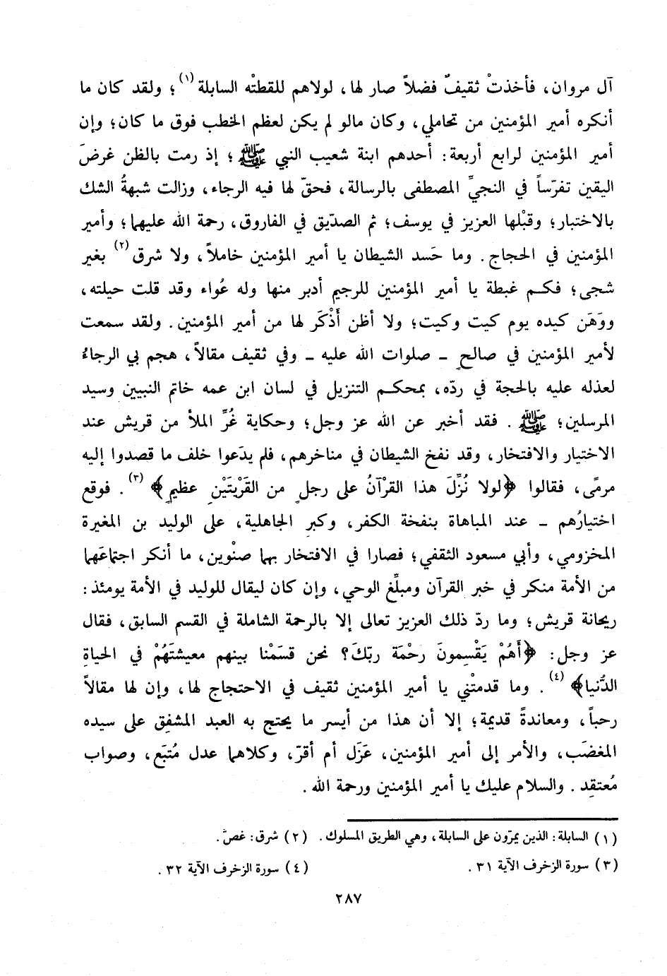 آل مروان، فأخذت ثقيف فضلا صار لها، لولاهم للقطته السابلة «1» ؛ ولقد كان ما أنكره أمير المؤمنين من تحاملي، وكان ما لو لم يكن لعظم الخطب فوق ما كان؛ وإن أمير المؤمنين لرابع أربعة: أحدهم ابنة شعيب النبي صلّى الله عليه وسلم؛ إذ رمت بالظن غرض اليقين تفرّسا في النجيّ المصطفى بالرسالة، فحقّ لها فيه الرجاء، وزالت شبهة الشك بالاختبار؛ وقبلها العزيز في يوسف؛ ثم الصدّيق في الفاروق، رحمة الله عليهما؛ وأمير المؤمنين في الحجاج. وما حسد الشيطان يا أمير المؤمنين خاملا، ولا شرق «2» بغير شجى؛ فكم غبطة يا أمير المؤمنين للرجيم أدبر منها وله عواء وقد قلت حيلته، ووهن كيده يوم كيت وكيت؛ ولا أظن أذكر لها من أمير المؤمنين. ولقد سمعت لأمير المؤمنين في صالح- صلوات الله عليه- وفي ثقيف مقالا، هجم بي الرجاء لعذله عليه بالحجة في ردّه، بمحكم التنزيل في لسان ابن عمه خاتم النبيين وسيد المرسلين؛ صلّى الله عليه وسلم. فقد أخبر عن الله عز وجل؛ وحكاية غرّ الملأ من قريش عند الاختيار والافتخار، وقد نفخ الشيطان في مناخرهم، فلم يدعوا خلف ما قصدوا إليه مرمى، فقالوا لَوْلا نُزِّلَ هذَا الْقُرْآنُ عَلى رَجُلٍ مِنَ الْقَرْيَتَيْنِ عَظِيمٍ