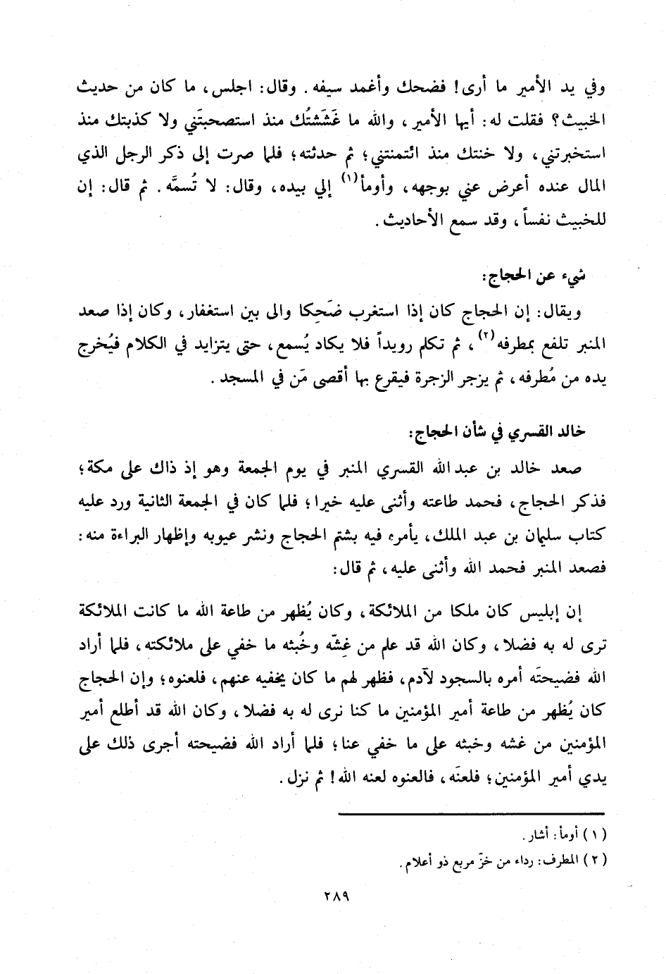 ويقال: إن الحجاج كان إذا استغرب ضحكا والى بين استغفار، وكان إذا صعد المنبر تلفع بمطرفه «2» ، ثم تكلم رويدا فلا يكاد يسمع، حتى يتزايد في الكلام فيخرج يده من مطرفه، ثم يزجر الزجرة فيقرع بها أقصى من في المسجد.