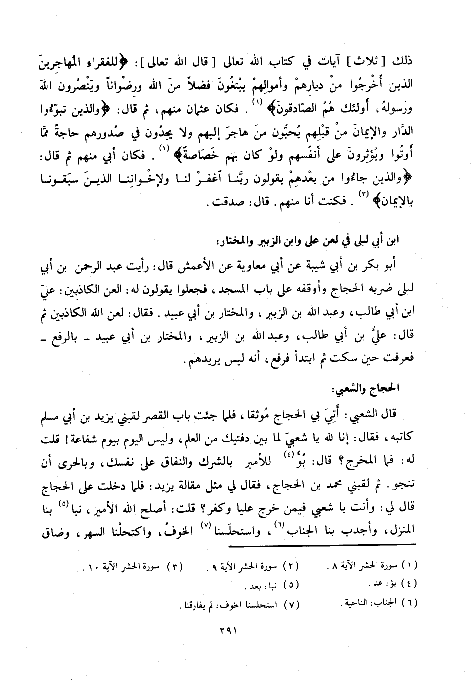 أبو بكر بن أبي شيبة عن أبي معاوية عن الأعمش قال: رأيت عبد الرحمن بن أبي ليلى ضربه الحجاج وأوقفه على باب المسجد، فجعلوا يقولون له: العن الكاذبين: عليّ ابن أبي طالب، وعبد الله بن الزبير، والمختار بن أبي عبيد. فقال: لعن الله الكاذبين ثم قال: عليّ بن أبي طالب، وعبد الله بن الزبير، والمختار بن أبي عبيد- بالرفع- فعرفت حين سكت ثم ابتدأ فرفع، أنه ليس يريدهم.