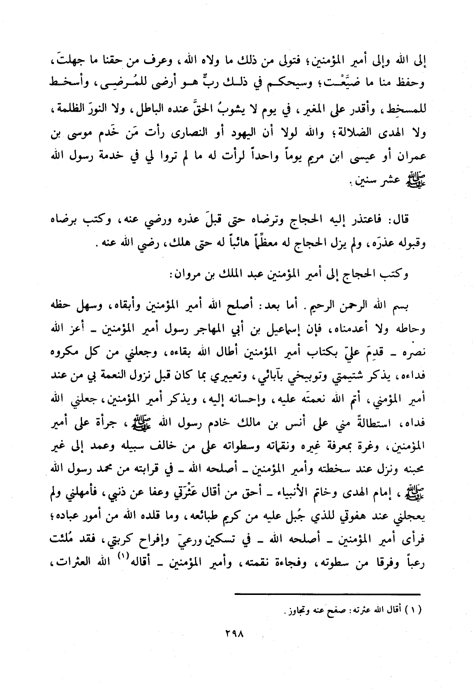 بسم الله الرحمن الرحيم. أما بعد: أصلح الله أمير المؤمنين وأبقاه، وسهل حظه وحاطه ولا أعدمناه، فإن إسماعيل بن أبي المهاجر رسول أمير المؤمنين- أعز الله نصره- قدم عليّ بكتاب أمير المؤمنين أطال الله بقاءه، وجعلني من كل مكروه فداءه، يذكر شتيمتي وتوبيخي بآبائي، وتعييري بما كان قبل نزول النعمة بي من عند أمير المؤمنين، أتم الله نعمته عليه، وإحسانه إليه، ويذكر أمير المؤمنين، جعلني الله فداه، استطالة مني على أنس بن مالك خادم رسول الله صلّى الله عليه وسلم، جرأة على أمير المؤمنين، وغرة بمعرفة غيره ونقماته وسطواته على من خالف سبيله وعمد إلى غير محبنه ونزل عند سخطته وأمير المؤمنين- أصلحه الله- في قرابته من محمد رسول الله صلّى الله عليه وسلم، إمام الهدى وخاتم الأنبياء- أحق من أقال عثرتي وعفا عن ذنبي، فأمهلني ولم يعجلني عند هفوتي للذي جبل عليه من كريم طبائعه، وما قلده الله من أمور عباده؛ فرأى أمير المؤمنين- أصلحه الله- في تسكين ورعيّ وإفراح كربتي، فقد ملئت رعبا وفرقا من سطوته، وفجاءة نقمته، وأمير المؤمنين- أقاله «1» الله العثرات،