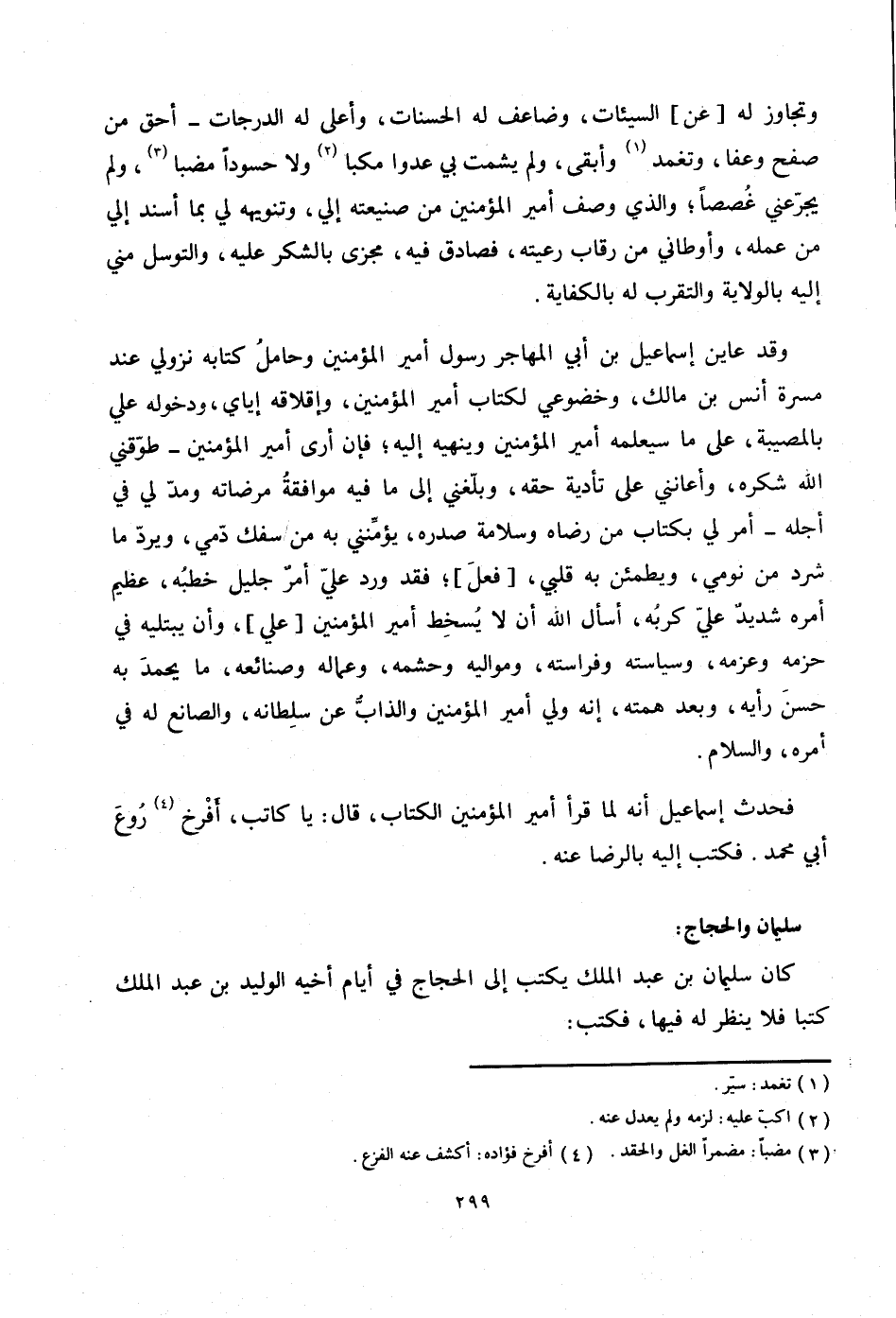 وقد عاين إسماعيل بن أبي المهاجر رسول أمير المؤمنين وحامل كتابه نزولي عند مسرة أنس بن مالك، وخضوعي لكتاب أمير المؤمنين، وإقلاقه إياي، ودخوله علي بالمصيبة، على ما سيعلمه أمير المؤمنين وينهيه إليه؛ فإن أرى أمير المؤمنين- طوّقني الله شكره، وأعانني على تأدية حقه، وبلّغني إلى ما فيه موافقة مرضاته ومدّ لي في أجله- أمر لي بكتاب من رضاه وسلامة صدره، يؤمّنني به من سفك دمي، ويردّ ما شرد من نومي، ويطمئن به قلبي، [فعل] ؛ فقد ورد عليّ أمر جليل خطبه، عظيم أمره شديد عليّ كربه، أسأل الله أن لا يسخط أمير المؤمنين [علي] ، وأن يبتليه في حزمه وعزمه، وسياسته وفراسته، ومواليه وحشمه، وعماله وصنائعه، ما يحمد به حسن رأيه، وبعد همته، إنه ولي أمير المؤمنين والذابّ عن سلطانه، والصانع له في أمره، والسلام.