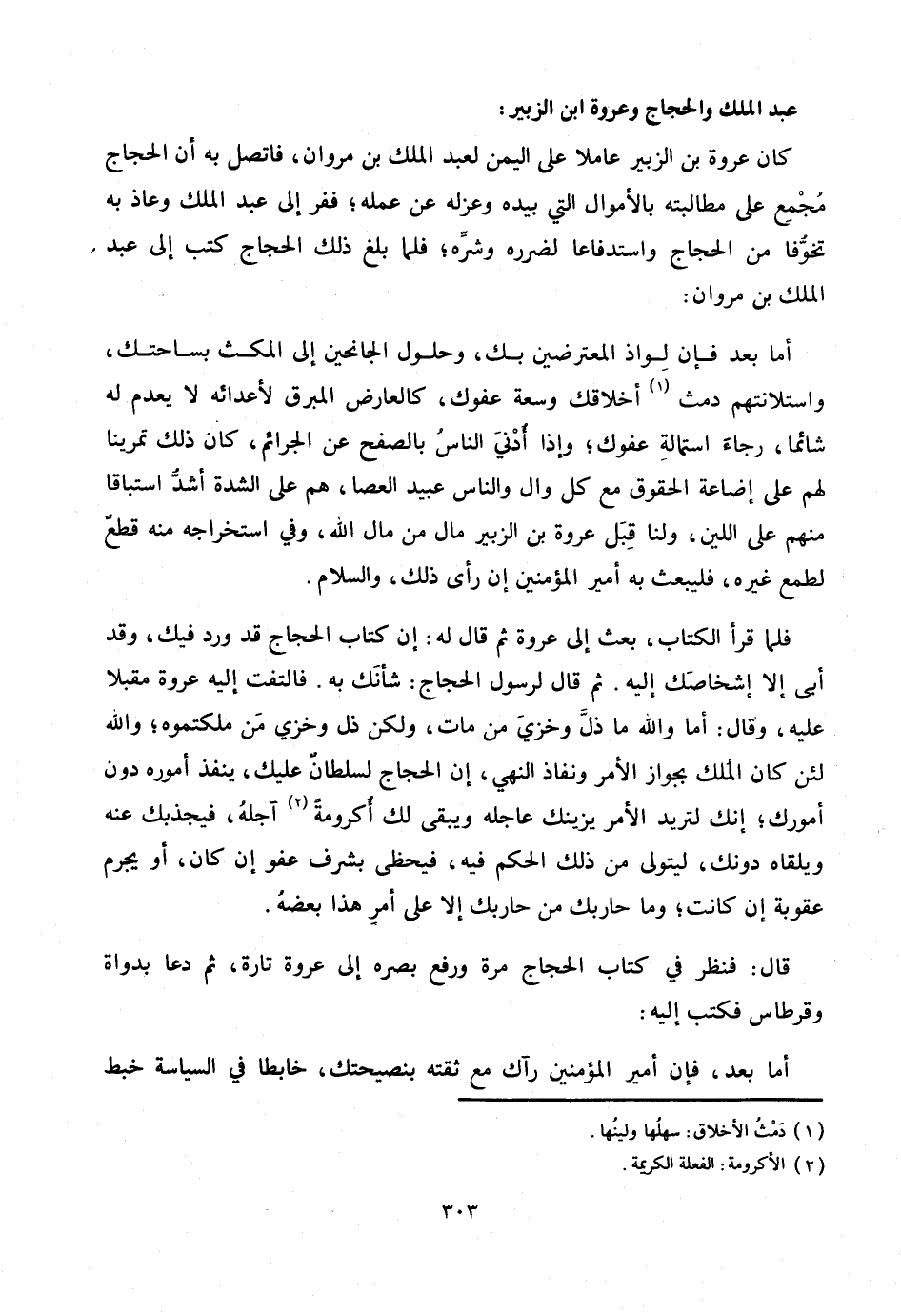 أما بعد فإن لواذ المعترضين بك، وحلول الجانحين إلى المكث بساحتك، واستلانتهم دمث «1» أخلاقك وسعة عفوك، كالعارض المبرق لأعدائه لا يعدم له شائما، رجاء استمالة عفوك؛ وإذا أدني الناس بالصفح عن الجرائم، كان ذلك تمرينا لهم على إضاعة الحقوق مع كل وال والناس عبيد العصا، هم على الشدة أشدّ استباقا منهم على اللين، ولنا قبل عروة بن الزبير مال من مال الله، وفي استخراجه منه قطع لطمع غيره، فليبعث به أمير المؤمنين إن رأى ذلك، والسلام.