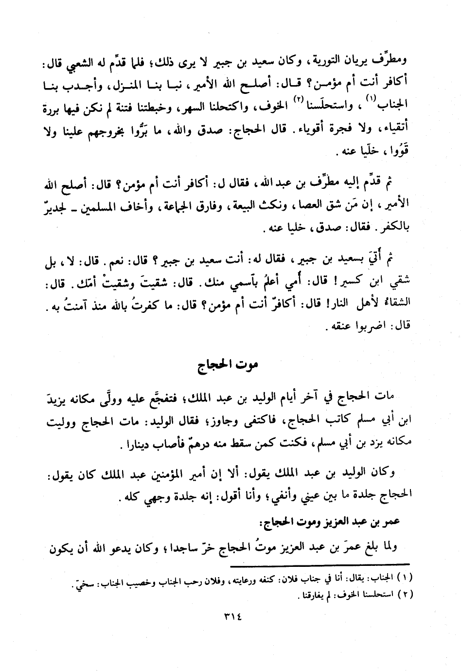 أكافر أنت أم مؤمن؟ قال: أصلح الله الأمير، نبا بنا المنزل، وأجدب بنا الجناب «1» ، واستحلسنا «2» الخوف، واكتحلنا السهر، وخبطتنا فتنة لم نكن فيها بررة أتقياء، ولا فجرة أقوياء. قال الحجاج: صدق والله، ما برّوا بخروجهم علينا ولا قووا، خلّيا عنه.
