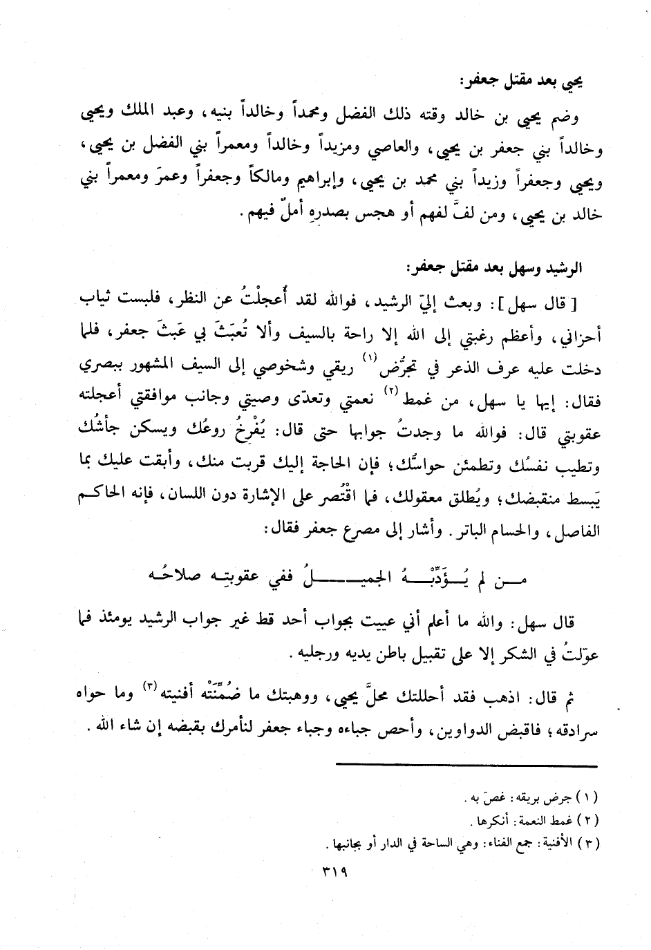 ثم قال: اذهب فقد أحللتك محلّ يحيى، ووهبتك ما ضمّنته أفنيته «3» وما حواه سرادقه؛ فاقبض الدواوين، وأحص جباءه وجباء جعفر لنأمرك بقبضه إن شاء الله.