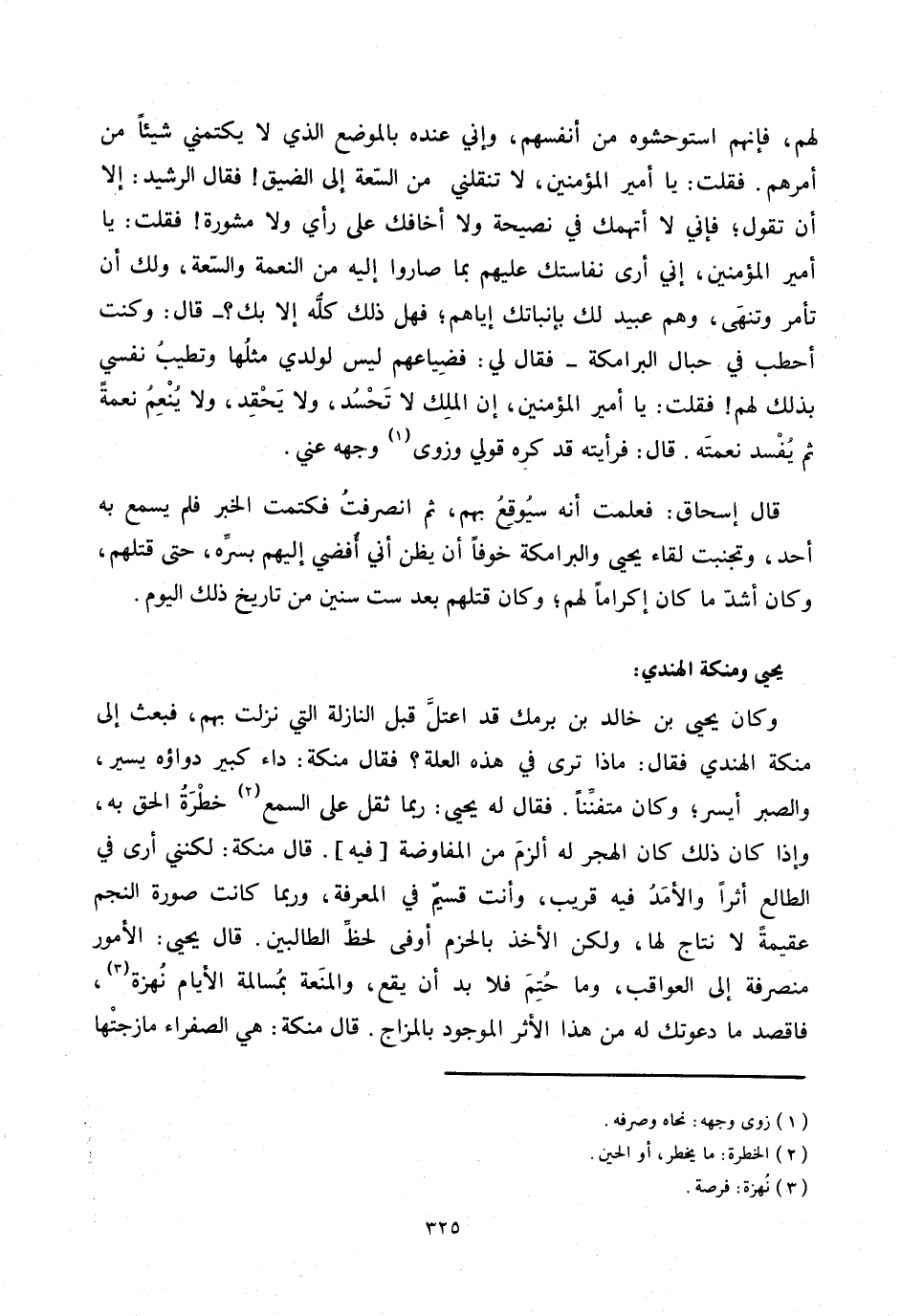 وكان يحيى بن خالد بن برمك قد اعتلّ قبل النازلة التي نزلت بهم، فبعث إلى منكة الهندي فقال: ماذا ترى في هذه العلة؟ فقال منكة: داء كبير دواؤه يسير، والصبر أيسر؛ وكان متفنّنا. فقال له يحيى: ربما ثقل على السمع «2» خطرة الحق به، وإذا كان ذلك كان الهجر له ألزم من المفاوضة [فيه] . قال منكة: لكنني أرى في الطالع أثرا والأمد فيه قريب، وأنت قسيم في المعرفة، وربما كانت صورة النجم عقيمة لا نتاج لها، ولكن الأخذ بالحزم أوفى لحظّ الطالبين. قال يحيى: الأمور منصرفة إلى العواقب، وما حتم فلا بد أن يقع، والمنعة بمسالمة الأيام نهزة «3» ، فاقصد ما دعوتك له من هذا الأثر الموجود بالمزاج. قال منكة: هي الصفراء مازجتها