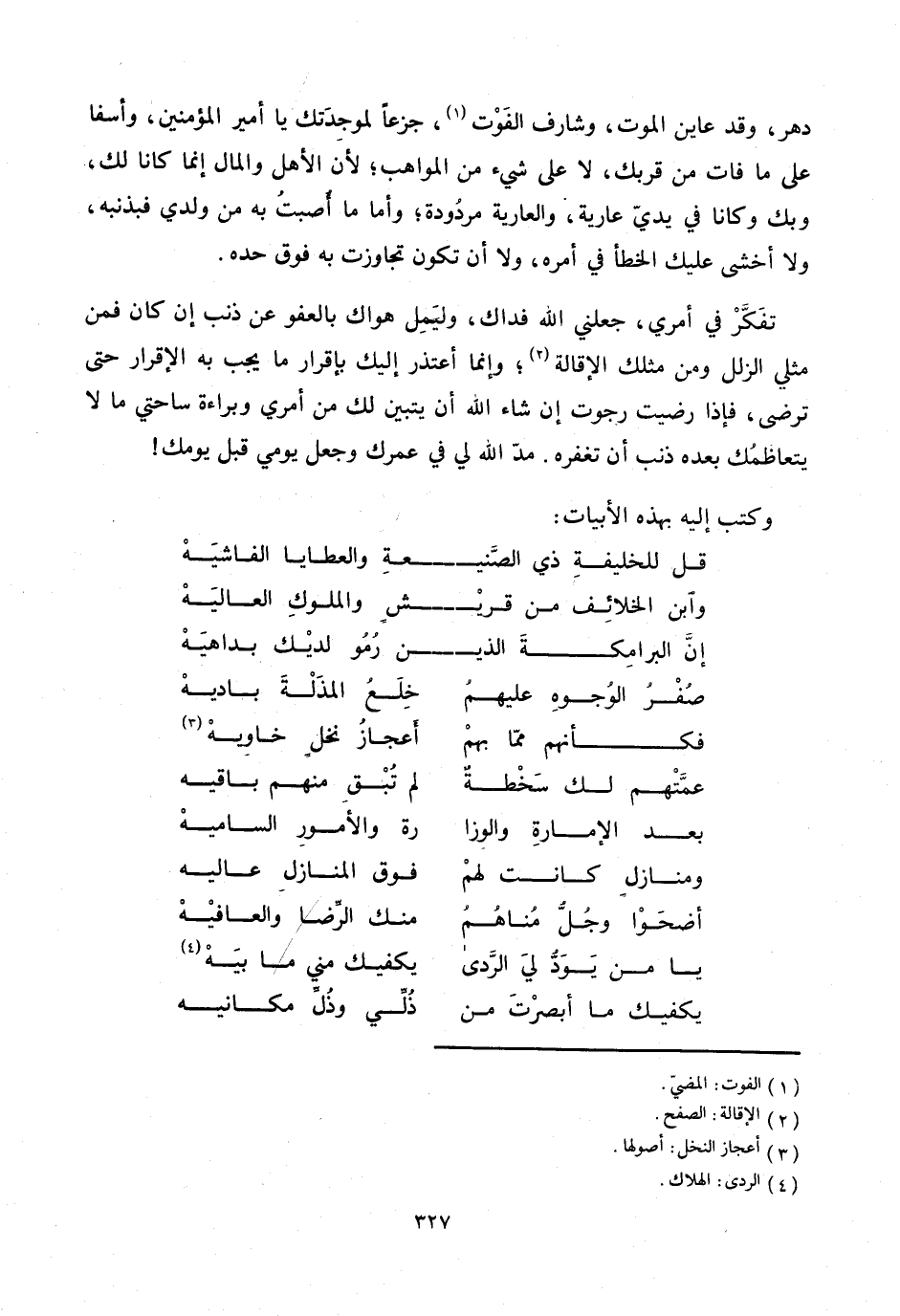 تفكّر في أمري، جعلني الله فداك، وليمل هواك بالعفو عن ذنب إن كان فمن مثلي الزلل ومن مثلك الإقالة «2» ؛ وإنما أعتذر إليك بإقرار ما يجب به الإقرار حتى ترضي، فإذا رضيت رجوت إن شاء الله أن يتبين لك من أمري وبراءة ساحتي ما لا يتعاظمك بعده ذنب أن تغفره. مدّ الله لي في عمرك وجعل يومي قبل يومك! وكتب إليه بهذه الأبيات: