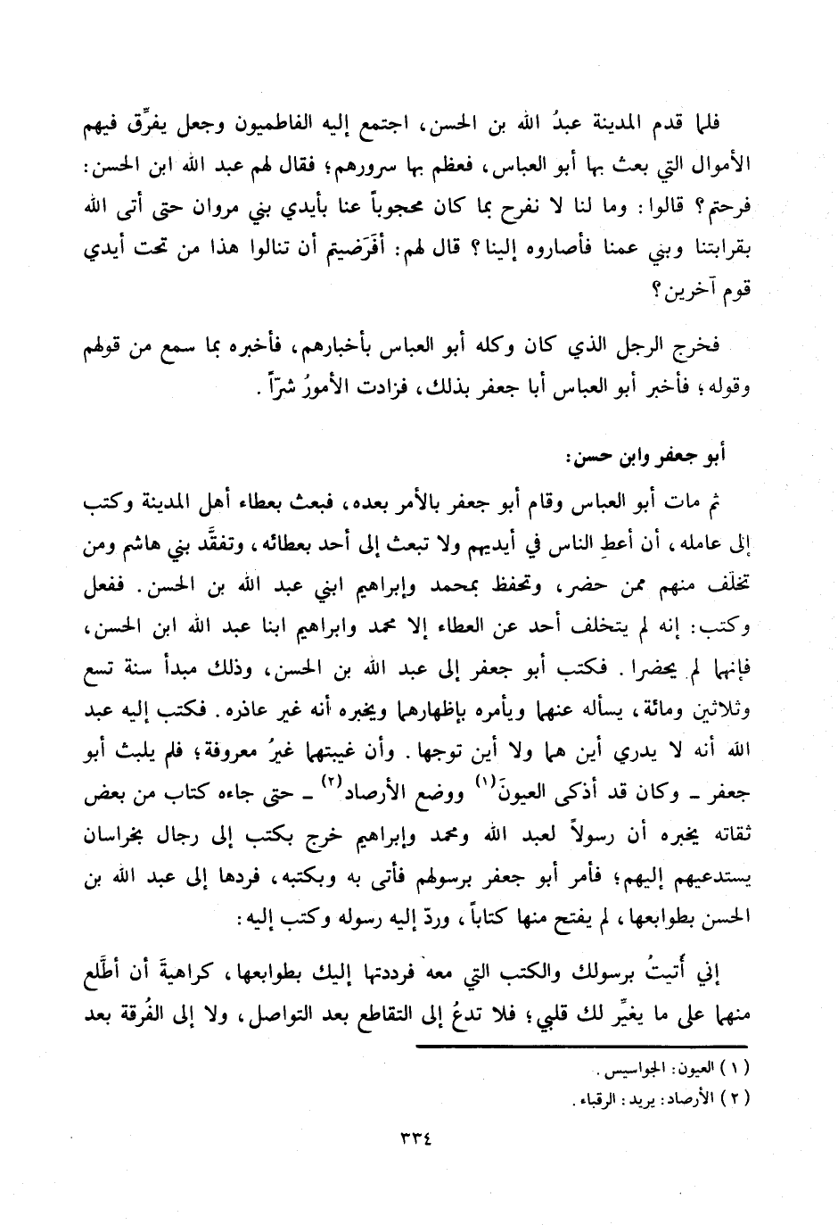 ثم مات أبو العباس وقام أبو جعفر بالأمر بعده، فبعث بعطاء أهل المدينة وكتب إلى عامله، أن أعط الناس في أيديهم ولا تبعث إلى أحد بعطائه، وتفقّد بني هاشم ومن تخلّف منهم ممن حضر، وتحفظ بمحمد وإبراهيم ابني عبد الله بن الحسن. ففعل وكتب: إنه لم يتخلف أحد عن العطاء إلا محمد وابراهيم ابنا عبد الله ابن الحسن، فإنهما لم يحضرا. فكتب أبو جعفر إلى عبد الله بن الحسن، وذلك مبدأ سنة تسع وثلاثين ومائة، يسأله عنهما ويأمره بإظهارهما ويخبره أنه غير عاذره. فكتب إليه عبد الله أنه لا يدري أين هما ولا أين توجها. وأن غيبتهما غير معروفة؛ فلم يلبث أبو جعفر- وكان قد أذكى العيون «1» ووضع الأرصاد «2» - حتى جاءه كتاب من بعض ثقاته يخبره أن رسولا لعبد الله ومحمد وإبراهيم خرج بكتب إلى رجال بخراسان يستدعيهم إليهم؛ فأمر أبو جعفر برسولهم فأتى به وبكتبه، فردها إلى عبد الله بن الحسن بطوابعها، لم يفتح منها كتابا، وردّ إليه رسوله وكتب إليه: