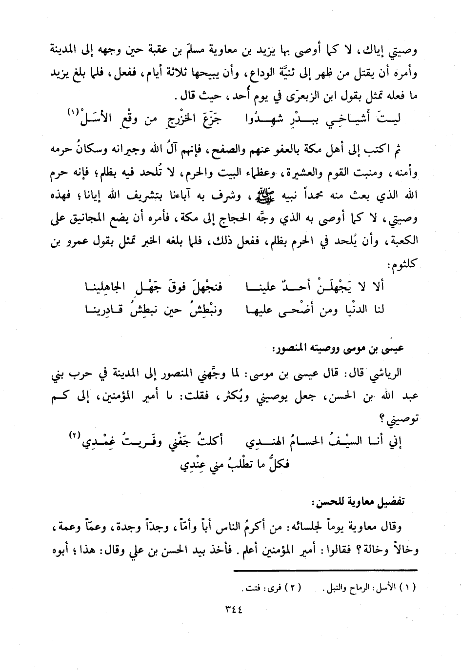 الرياشي قال: قال عيسى بن موسى: لما وجّهني المنصور إلى المدينة في حرب بني عبد الله بن الحسن، جعل يوصيني ويكثر، فقلت: يا أمير المؤمنين، إلى كم توصيني؟