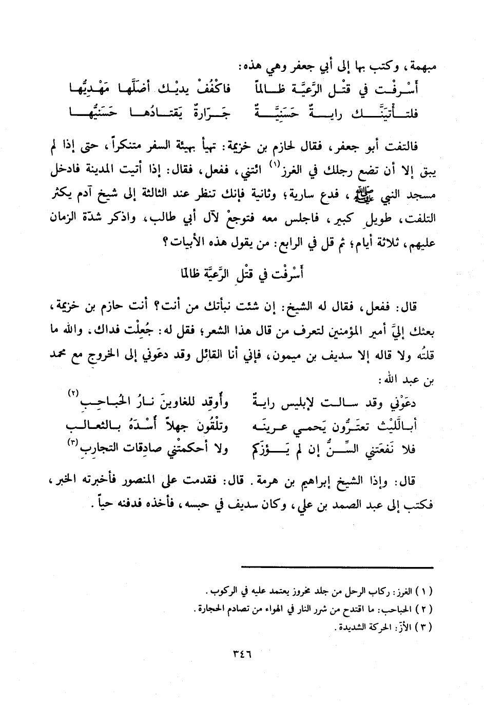 فالتفت أبو جعفر، فقال لحازم بن خزيمة: تهيأ بهيئة السفر متنكرا، حتى إذا لم يبق إلا أن تضع رجلك في الغرز «1» ائتني، ففعل، فقال: إذا أتيت المدينة فادخل مسجد النبي صلّى الله عليه وسلم، فدع سارية؛ وثانية فإنك تنظر عند الثالثة إلى شيخ آدم يكثر التلفت، طويل كبير، فاجلس معه فتوجع لآل أبي طالب، واذكر شدّة الزمان عليهم، ثلاثة أيام؛ ثم قل في الرابع: من يقول هذه الأبيات؟