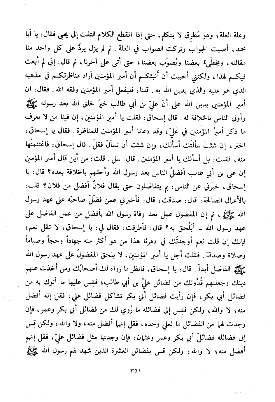 وعلة العلة؛ وهو مطرق لا يتكلم، حتى إذا انقطع الكلام التفت إلى يحيى فقال: يا أبا محمد، أصبت الجواب وتركت الصواب في العلة. ثم لم يزل يردّ على كل واحد منا مقالته، ويخطّىء بعضنا ويصوّب بعضنا؛ حتى أتى على آخرنا، ثم قال: إني لم أبعث فيكم لهذا، ولكنني أحببت أن أنبئكم أن أمير المؤمنين أراد مناظرتكم في مذهبه الذي هو عليه والذي يدين الله به. قلنا: فليفعل أمير المؤمنين وفقه الله. فقال: إن أمير المؤمنين يدين الله على أنّ عليّ بن أبي طالب خير خلق الله بعد رسوله صلّى الله عليه وسلم وأولى الناس بالخلافة له. قال إسحاق: فقلت يا أمير المؤمنين، إن فينا من لا يعرف ما ذكر أمير المؤمنين في عليّ، وقد دعانا أمير المؤمنين للمناظرة. فقال يا إسحاق، اختر، إن شئت سألتك أسألك، وإن شئت أن تسأل فقل. قال إسحاق: فاغتنمتها منه، فقلت: بل أسألك يا أمير المؤمنين. قال: سل. قلت: من أين قال أمير المؤمنين إن علي بن أبي طالب أفضل الناس بعد رسول الله وأحقهم بالخلافة بعده؟ قال: يا إسحاق، خبّرني عن الناس: بم يتفاضلون حتى يقال فلان أفضل من فلان؟ قلت: