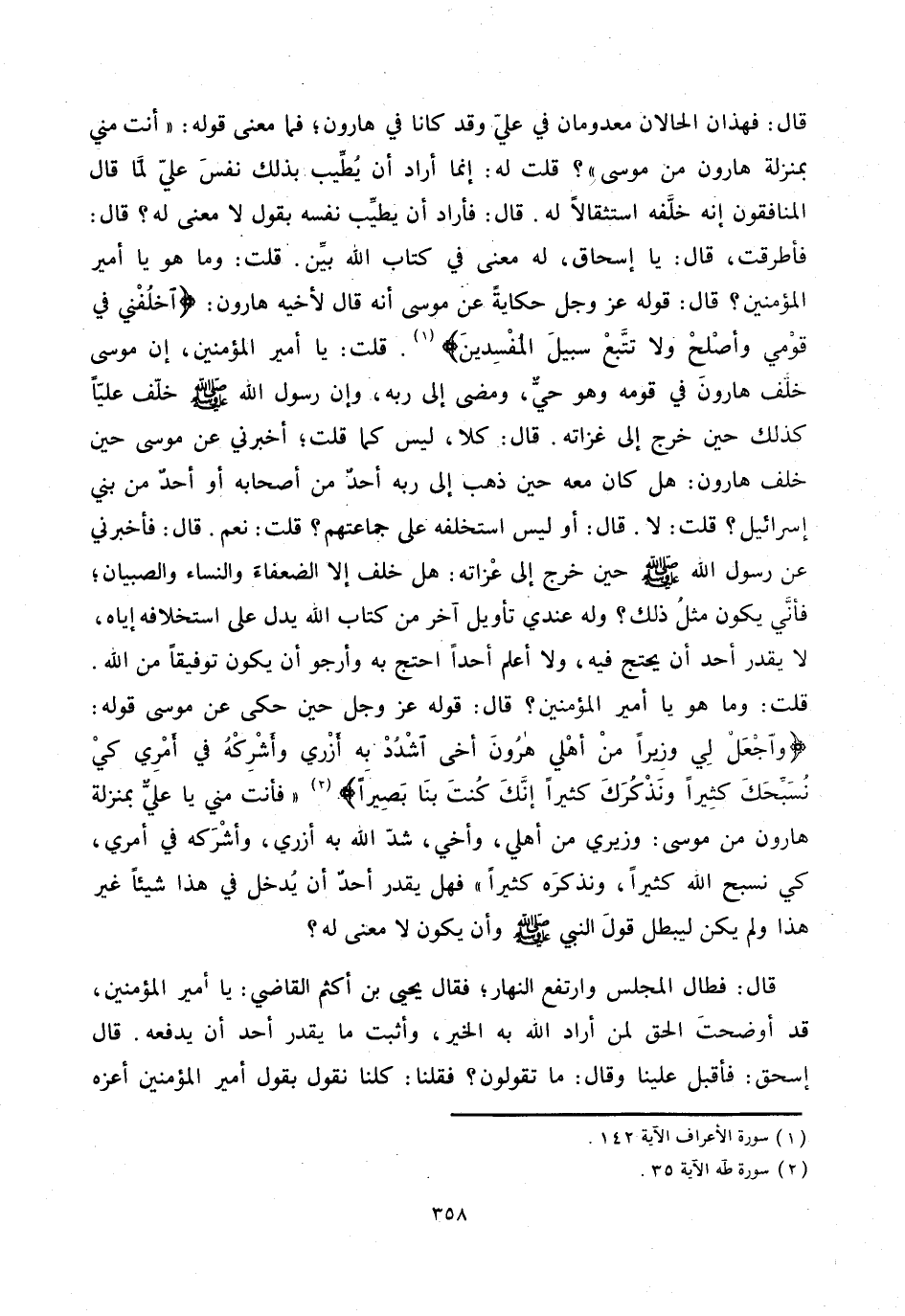 «2» «فأنت مني يا عليّ بمنزلة هارون من موسى: وزيري من أهلي، وأخي، شدّ الله به أزري، وأشركه في أمري، كي نسبح الله كثيرا، ونذكره كثيرا» فهل يقدر أحد أن يدخل في هذا شيئا غير هذا ولم يكن ليبطل قول النبي صلّى الله عليه وسلم وأن يكون لا معنى له؟