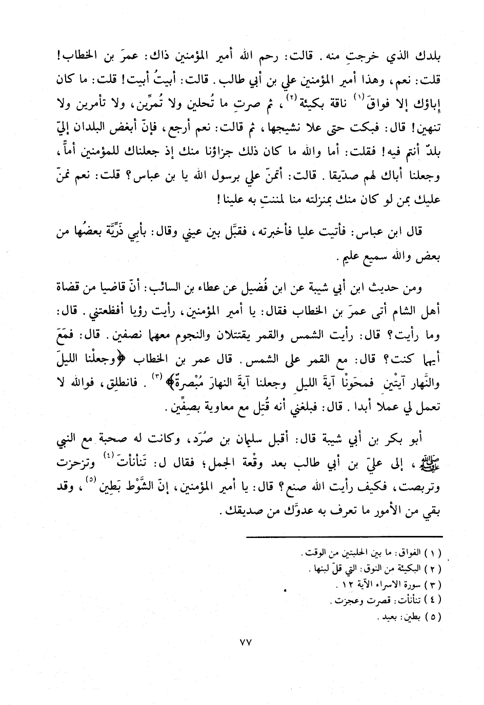 وما رأيت؟ قال: رأيت الشمس والقمر يقتتلان والنجوم معهما نصفين. قال: فمع أيهما كنت؟ قال: مع القمر على الشمس. قال عمر بن الخطاب وَجَعَلْنَا اللَّيْلَ وَالنَّهارَ آيَتَيْنِ فَمَحَوْنا آيَةَ اللَّيْلِ وَجَعَلْنا آيَةَ النَّهارِ مُبْصِرَةً