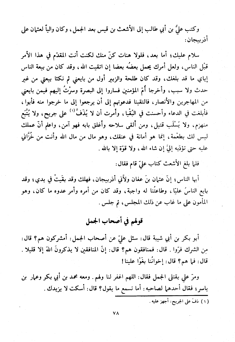 أبو بكر بن أبي شيبة قال: سئل عليّ عن أصحاب الجمل: أمشركون هم؟ قال: