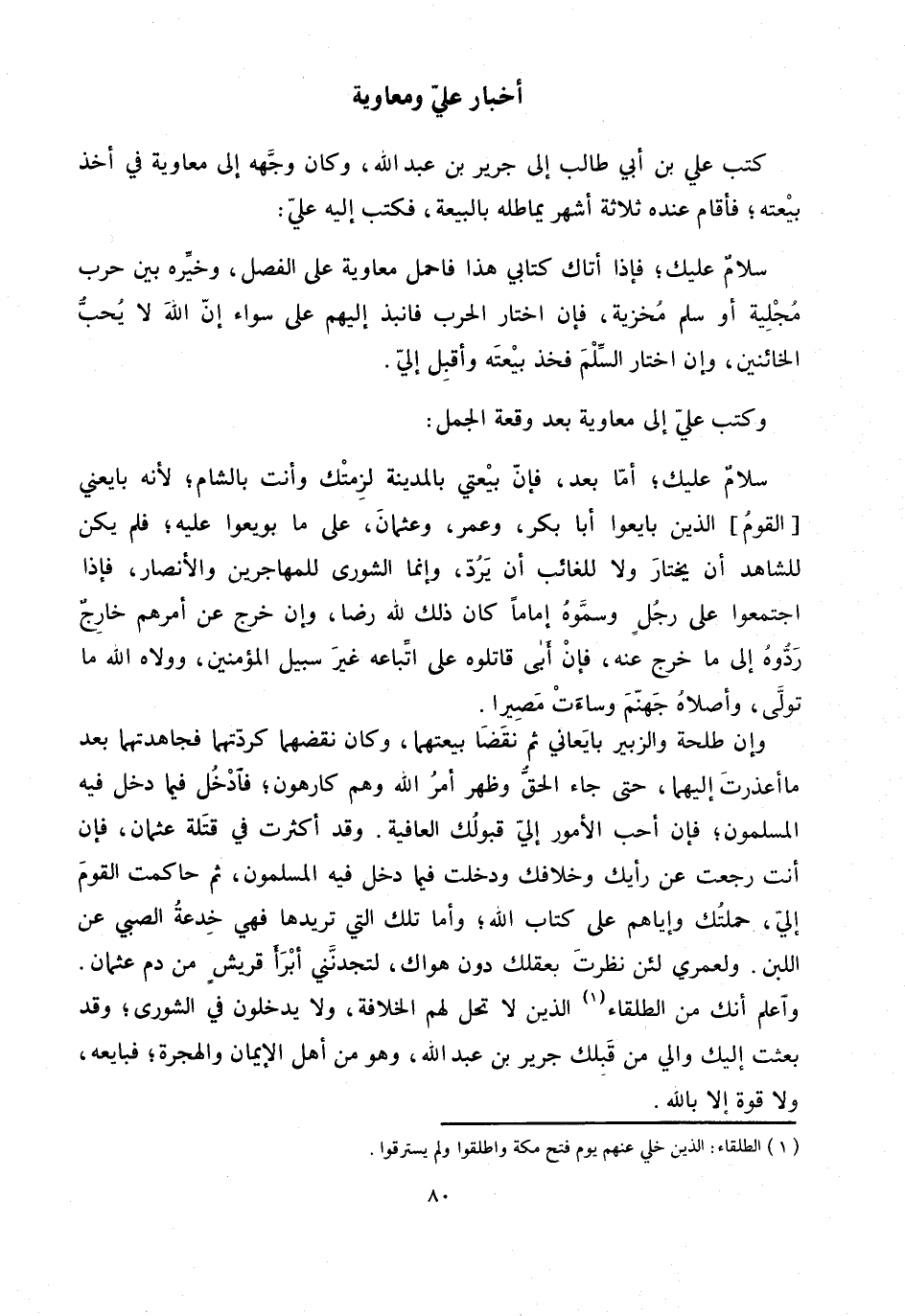 وإن طلحة والزبير بايعاني ثم نقضا بيعتهما، وكان نقضهما كردّتهما فجاهدتهما بعد ما أعذرت إليهما، حتى جاء الحقّ وظهر أمر الله وهم كارهون؛ فادخل فيما دخل فيه المسلمون؛ فإن أحب الأمور إليّ قبولك العافية. وقد أكثرت في قتلة عثمان، فإن أنت رجعت عن رأيك وخلافك ودخلت فيما دخل فيه المسلمون، ثم حاكمت القوم إليّ، حملتك وإياهم على كتاب الله؛ وأما تلك التي تريدها فهي خدعة الصبي عن اللبن. ولعمري لئن نظرت بعقلك دون هواك، لتجدنّني أبرأ قريش من دم عثمان.