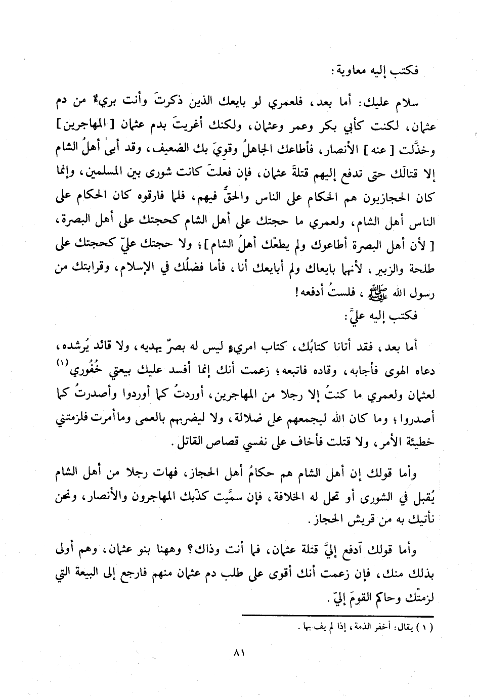 سلام عليك: أما بعد، فلعمري لو بايعك الذين ذكرت وأنت بريء من دم عثمان، لكنت كأبي بكر وعمر وعثمان، ولكنك أغريت بدم عثمان [المهاجرين] وخذّلت [عنه] الأنصار، فأطاعك الجاهل وقوي بك الضعيف، وقد أبي أهل الشام إلا قتالك حتى تدفع إليهم قتلة عثمان، فإن فعلت كانت شورى بين المسلمين، وإنما كان الحجازيون هم الحكام على الناس والحقّ فيهم، فلما فارقوه كان الحكام على الناس أهل الشام، ولعمري ما حجتك على أهل الشام كحجتك على أهل البصرة، [لأن أهل البصرة أطاعوك ولم يطعك أهل الشام] ؛ ولا حجتك عليّ كحجتك على طلحة والزبير، لأنهما بايعاك ولم أبايعك أنا، فأما فضلك في الإسلام، وقرابتك من رسول الله صلّى الله عليه وسلم، فلست أدفعه! فكتب إليه عليّ: