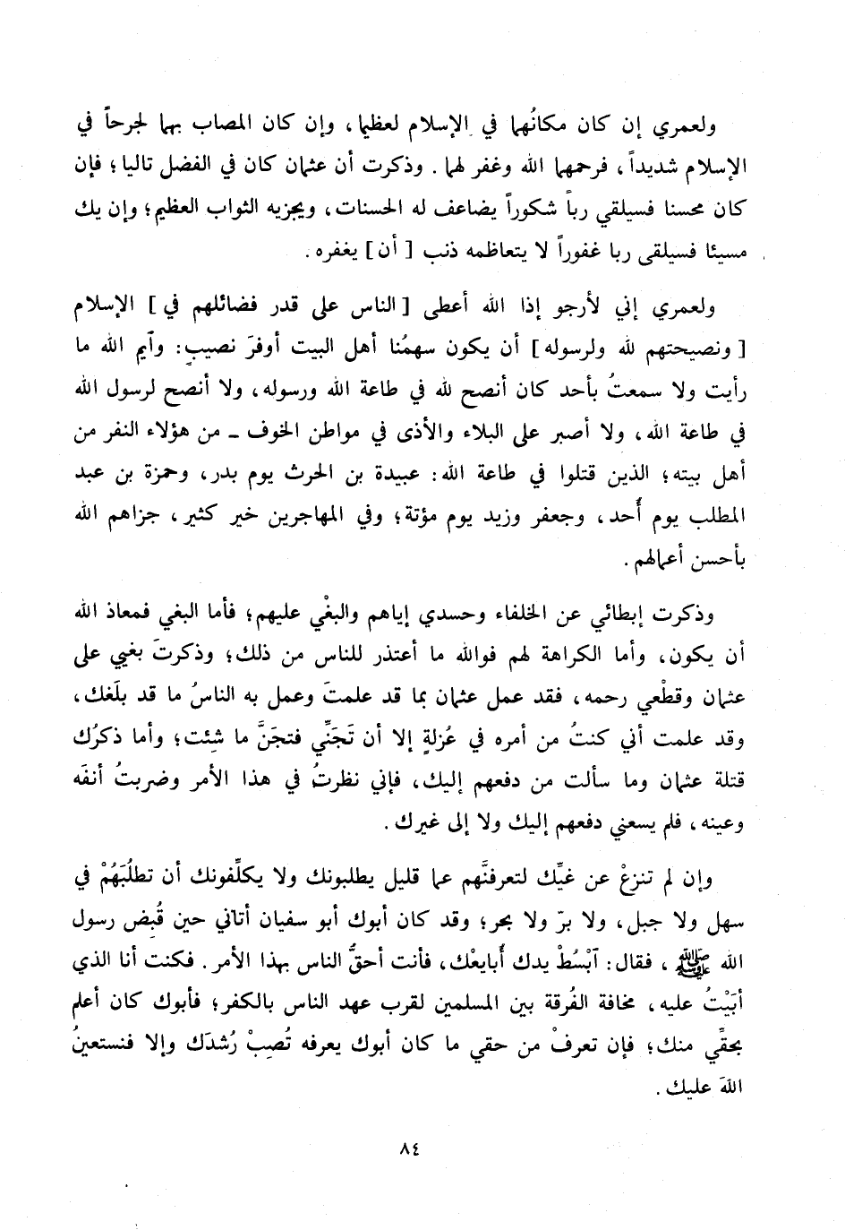 ولعمري إن كان مكانهما في الإسلام لعظيما، وإن كان المصاب بهما لجرحا في الإسلام شديدا، فرحمهما الله وغفر لهما. وذكرت أن عثمان كان في الفضل تاليا؛ فإن كان محسنا فسيلقي ربا شكورا يضاعف له الحسنات، ويجزيه الثواب العظيم؛ وإن يك مسيئا فسيلقى ربا غفورا لا يتعاظمه ذنب [أن] يغفره.