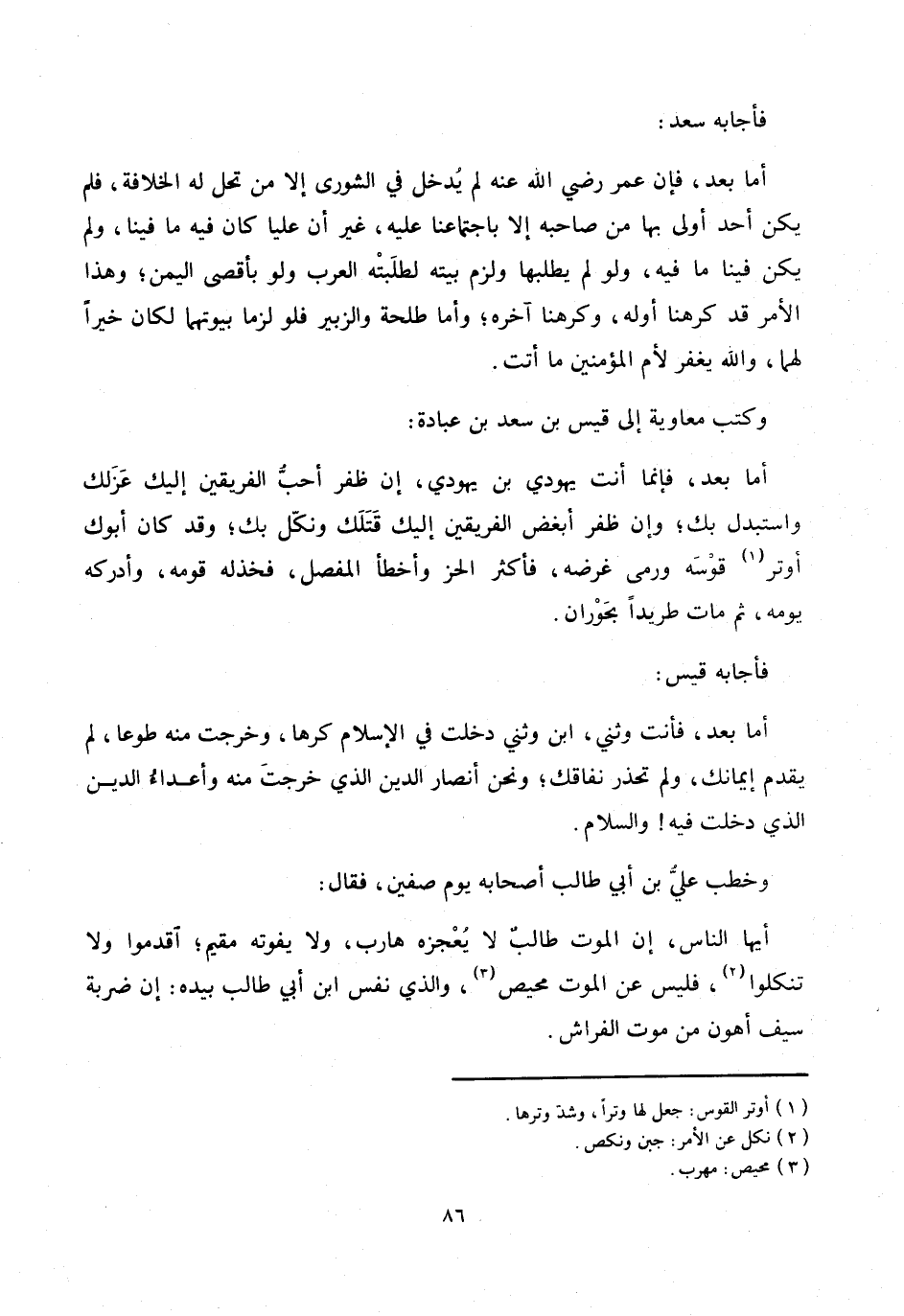 أما بعد، فإن عمر رضي الله عنه لم يدخل في الشورى إلا من تحل له الخلافة، فلم يكن أحد أولى بها من صاحبه إلا باجتماعنا عليه، غير أن عليا كان فيه ما فينا، ولم يكن فينا ما فيه، ولو لم يطلبها ولزم بيته لطلبته العرب ولو بأقصى اليمن؛ وهذا الأمر قد كرهنا أوله، وكرهنا آخره؛ وأما طلحة والزبير فلو لزما بيوتهما لكان خيرا لهما، والله يغفر لأم المؤمنين ما أتت.