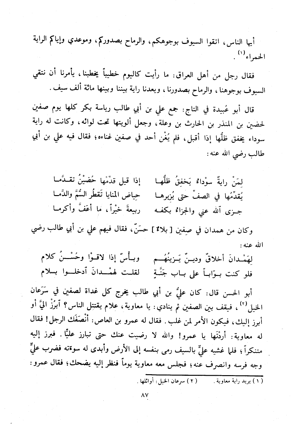 أبو الحسن قال: كان عليّ بن أبي طالب يخرج كل غداة لصفين في سرعان الخيل «2» ، فيقف بين الصفين ثم ينادي: يا معاوية، علام يقتتل الناس؟ ابرز اليّ أو أبرز إليك، فيكون الأمر لمن غلب. فقال له عمرو بن العاص: أنصفك الرجل! فقال له معاوية: أردتها يا عمرو! والله لا رضيت عنك حتى تبارز عليّا. فبرز إليه متنكرا؛ فلما غشيه عليّ بالسيف رمى بنفسه إلى الأرض وأبدى له سوءته فضرب عليّ وجه فرسه وانصرف عنه؛ فجلس معه معاوية يوما فنظر إليه يضحك؛ فقال عمرو: