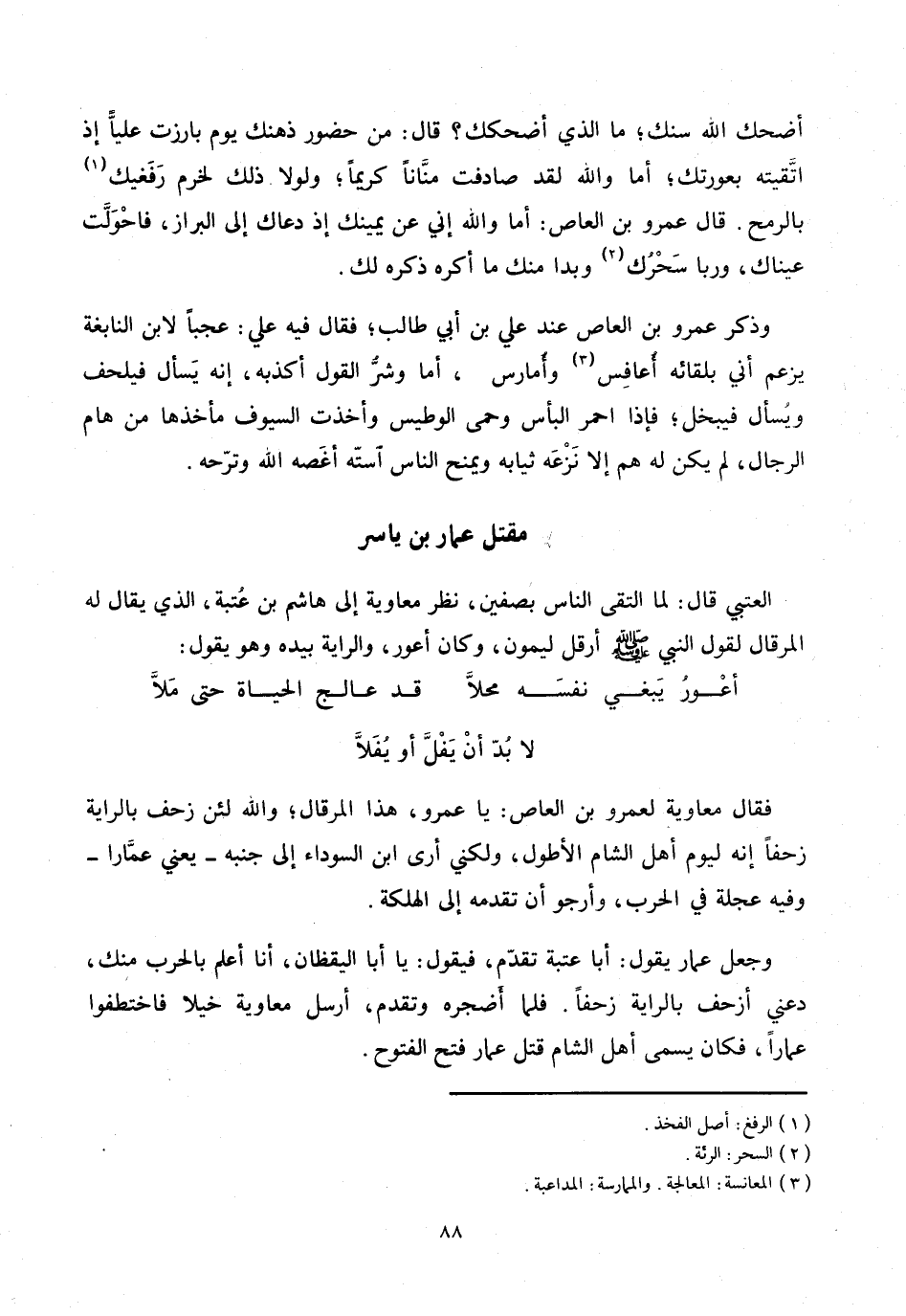 وجعل عمار يقول: أبا عتبة تقدّم، فيقول: يا أبا اليقظان، أنا أعلم بالحرب منك، دعني أزحف بالراية زحفا. فلما أضجره وتقدم، أرسل معاوية خيلا فاختطفوا عمارا، فكان يسمى أهل الشام قتل عمار فتح الفتوح.