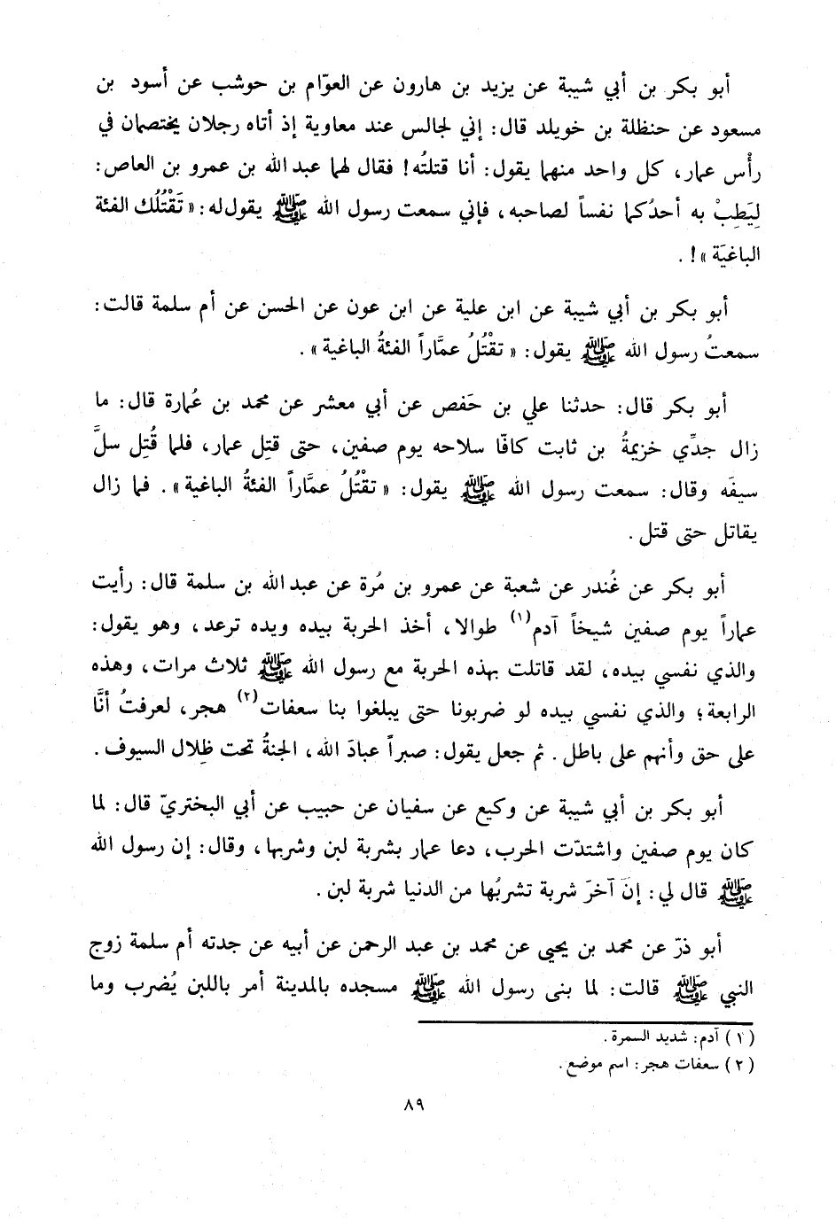 أبو بكر بن أبي شيبة عن يزيد بن هارون عن العوّام بن حوشب عن أسود بن مسعود عن حنظلة بن خويلد قال: إني لجالس عند معاوية إذ أتاه رجلان يختصمان في رأس عمار، كل واحد منهما يقول: أنا قتلته! فقال لهما عبد الله بن عمرو بن العاص: