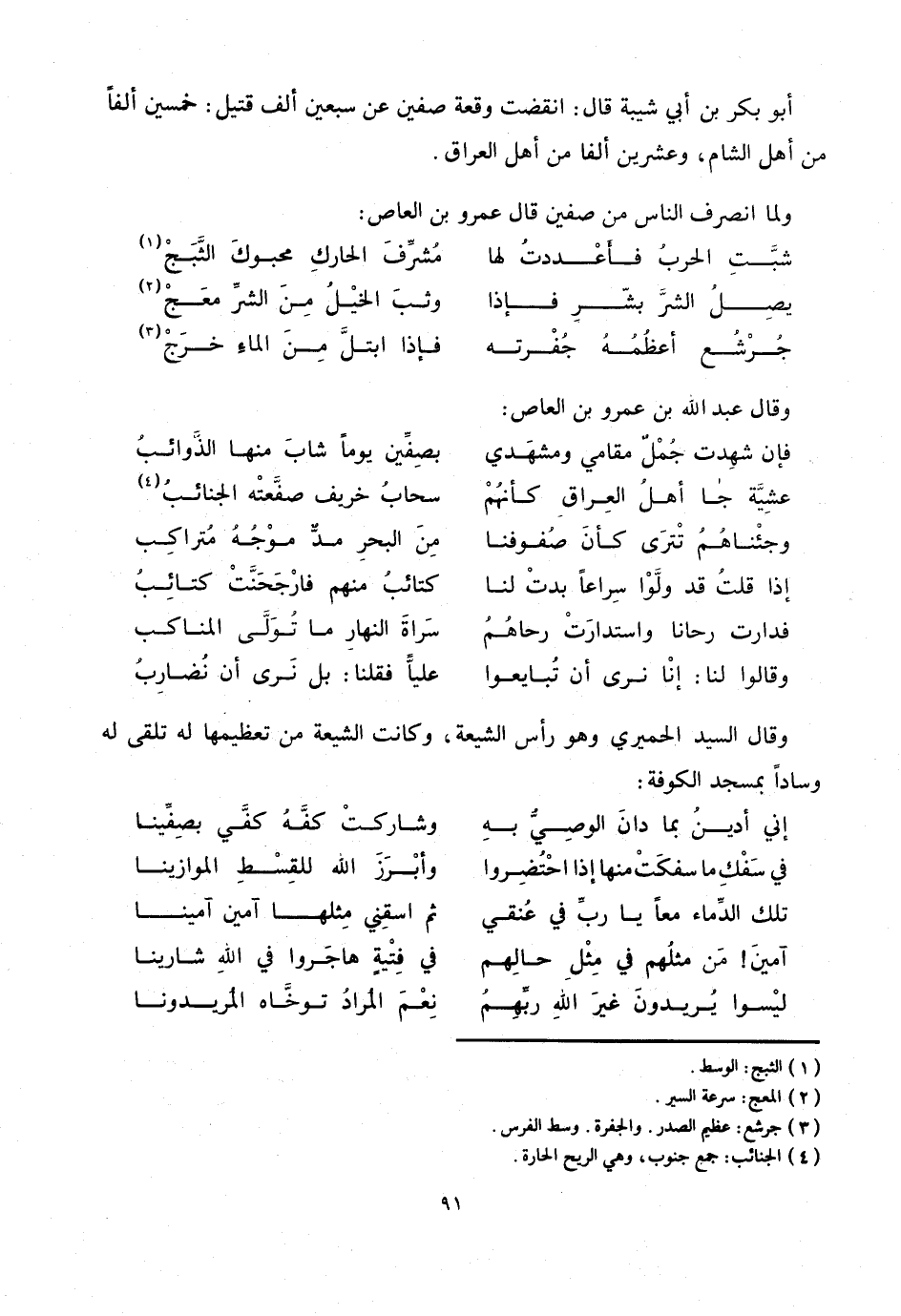 أبو بكر بن أبي شيبة قال: انقضت وقعة صفين عن سبعين ألف قتيل: خمسين ألفا من أهل الشام، وعشرين ألفا من أهل العراق.