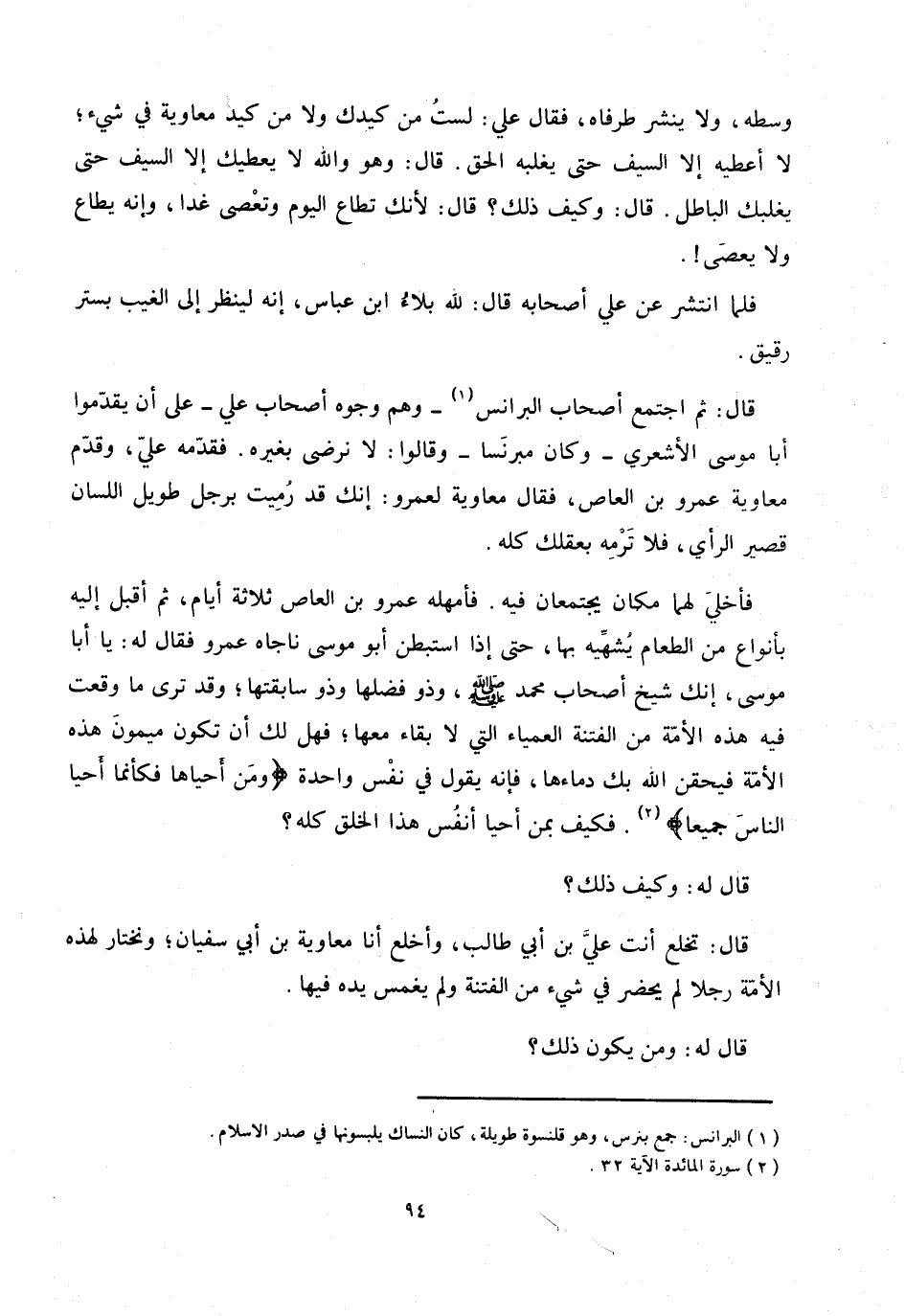 وسطه، ولا ينشر طرفاه، فقال علي: لست من كيدك ولا من كيد معاوية في شيء؛ لا أعطيه إلا السيف حتى يغلبه الحق. قال: وهو والله لا يعطيك إلا السيف حتى يغلبك الباطل. قال: وكيف ذلك؟ قال: لأنك تطاع اليوم وتعصي غدا، وإنه يطاع ولا يعصى!.