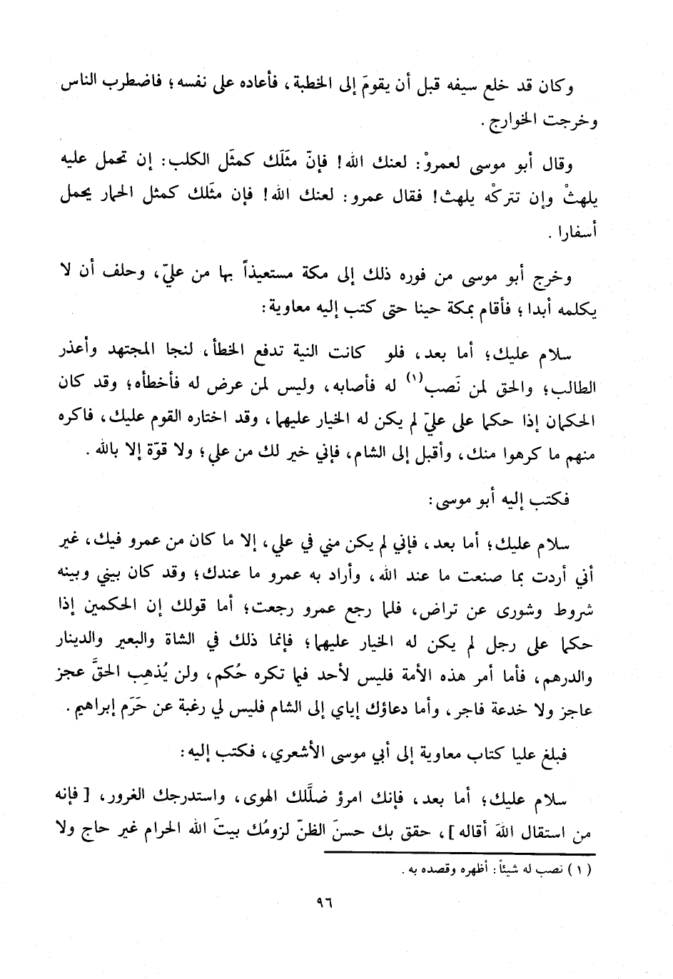 سلام عليك؛ أما بعد، فإني لم يكن مني في علي، إلا ما كان من عمرو فيك، غير أني أردت بما صنعت ما عند الله، وأراد به عمرو ما عندك، وقد كان بيني وبينه شروط وشورى عن تراض، فلما رجع عمرو رجعت؛ أما قولك إن الحكمين إذا حكما على رجل لم يكن له الخيار عليهما؛ فإنما ذلك في الشاة والبعير والدينار والدرهم، فأما أمر هذه الأمة فليس لأحد فيما تكره حكم، ولن يذهب الحقّ عجز عاجز ولا خدعة فاجر، وأما دعاؤك إياي إلى الشام فليس لي رغبة عن حرم إبراهيم.