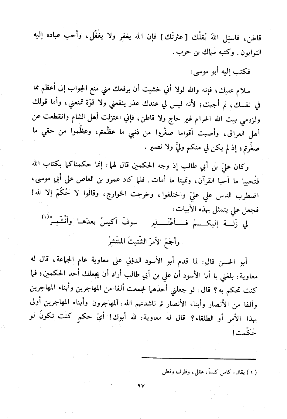 أبو الحسن قال: لما قدم أبو الأسود الدؤلي على معاوية عام الجماعة، قال له معاوية: بلغني يا أبا الأسود أن علي بن أبي طالب أراد أن يجعلك أحد الحكمين؛ فما كنت تحكم به؟ قال: لو جعلني أحدهما لجمعت ألفا من المهاجرين وأبناء المهاجرين وألف من الأنصار وأبناء الأنصار ثم ناشدتهم الله: آلمهاجرون وأبناء المهاجرين أولى بهذا الأمر أو الطلقاء؟ قال له معاوية: لله أبوك! أيّ حكم كنت تكون لو حكّمت!