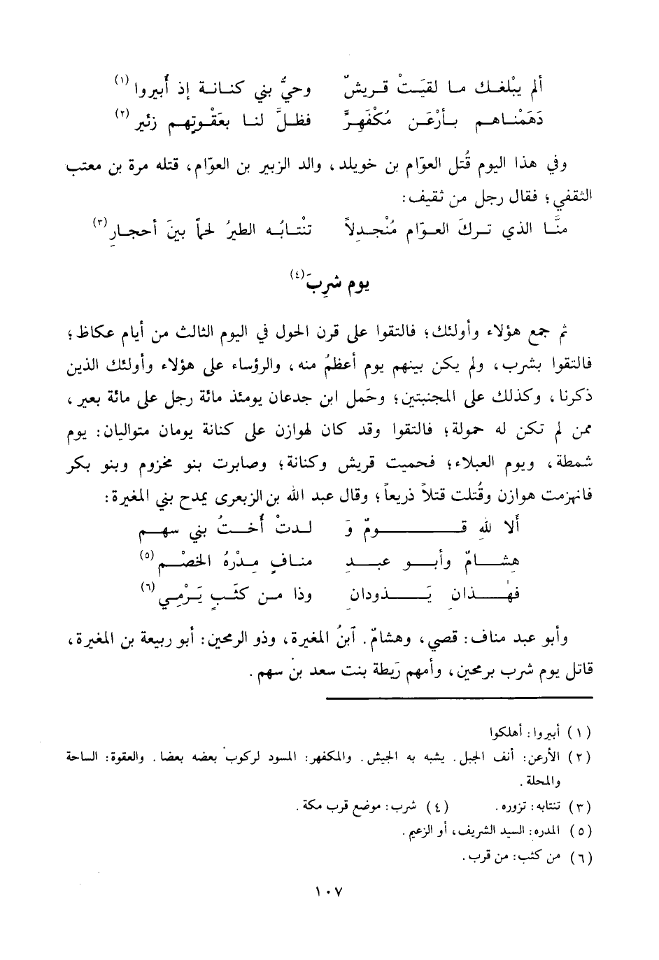 ثم جمع هؤلاء وأولئك، فالتقوا على قرن الحول في اليوم الثالث من أيام عكاظ، فالتقوا بشرب، ولم يكن بينهم يوم أعظم منه، والرؤساء على هؤلاء وأولئك الذين ذكرنا، وكذلك على المجنبتين، وحمل ابن جدعان يومئذ مائة رجل على مائة بعير، ممن لم تكن له حمولة، فالتقوا وقد كان لهوازن على كنانة يومان متواليان: يوم شمطة، ويوم العبلاء، فحميت قريش وكنانة، وصابرت بنو مخزوم وبنو بكر فانهزمت هوازن وقتلت قتلا ذريعا، وقال عبد الله بن الزبعري يمدح بني المغيرة: