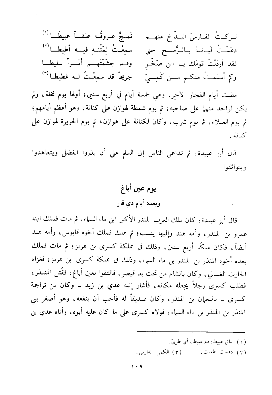 وبعده أيام ذي قار قال أبو عبيدة: كان ملك العرب المنذر الأكبر ابن ماء السماء، ثم مات فملك ابنه عمرو بن المنذر، وأمه هند وإليها ينسب، ثم هلك فملك أخوه قابوس، وأمه هند أيضا، فكان ملكه أربع سنين، وذلك في مملكة كسرى بن هرمز، ثم مات فملك بعده أخوه المنذر بن المنذر بن ماء السماء، وذلك في مملكة كسرى بن هرمز، فغزاه الحارث الغساني، وكان بالشام من تحت يد قيصر، فالتقوا بعين أباغ، فقتل المنذر، فطلب كسرى رجلا يجعله مكانه، فأشار إليه عدي بن زيد- وكان من تراجمة كسرى- بالنعمان بن المنذر، وكان صديقا له فأحب أن ينفعه، وهو أصغر بني المنذر بن المنذر بن ماء السماء، فولاه كسرى على ما كان عليه أبوه، وأتاه عدي بن