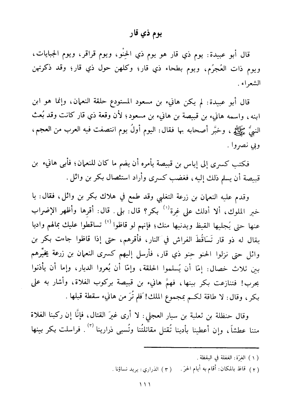 قال أبو عبيدة: يوم ذي قار هو يوم ذي الحنو، ويوم قراقر، ويوم الجبايات، ويوم ذات العجرم، ويوم بطحاء ذي قار، وكلهن حول ذي قار، وقد ذكرتهن الشعراء.