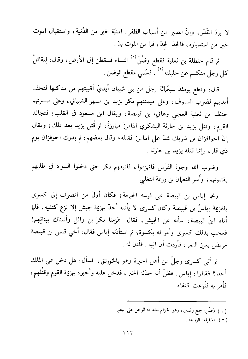 ثم قام حنظلة بن ثعلبة فقطع وضن «1» النساء فسقطن إلى الأرض، وقال: ليقاتل كل رجل منكم عن حليلته «2» . فسمي مقطع الوضن.