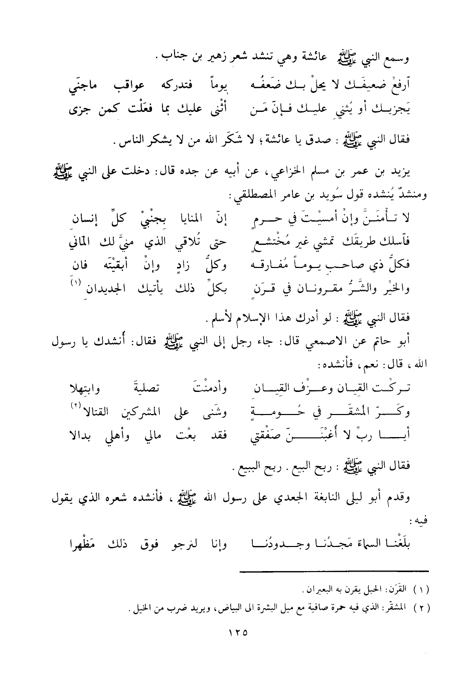 وسمع النبي صلّى الله عليه وسلّم عائشة وهي تنشد شعر زهير بن جناب.