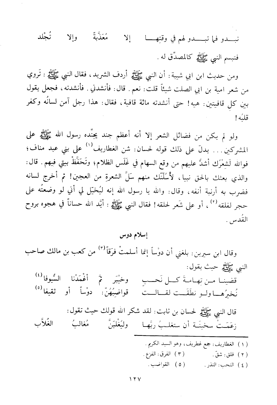 ومن حديث ابن ابي شيبة: أن النبي صلّى الله عليه وسلّم أردف الشريد، فقال النبي صلّى الله عليه وسلّم: تروي من شعر امية بن ابي الصلت شيئا قلت: نعم. قال: فأنشدني. فأنشدته، فجعل يقول بين كل قافيتين: هيه! حتى أنشدته مائة قافية، فقال: هذا رجل آمن لسانه وكفر قلبه! ولو لم يكن من فضائل الشعر إلا أنه أعظم جند يجنّده رسول الله صلّى الله عليه وسلّم على المشركين ... يدلّ على ذلك قوله لحسان: شن الغطاريف «1» على بني عبد مناف، فوالله لشعرك أشدّ عليهم من وقع السهام في غلس الظلام، وتحفّظ بيتي فيهم. قال: