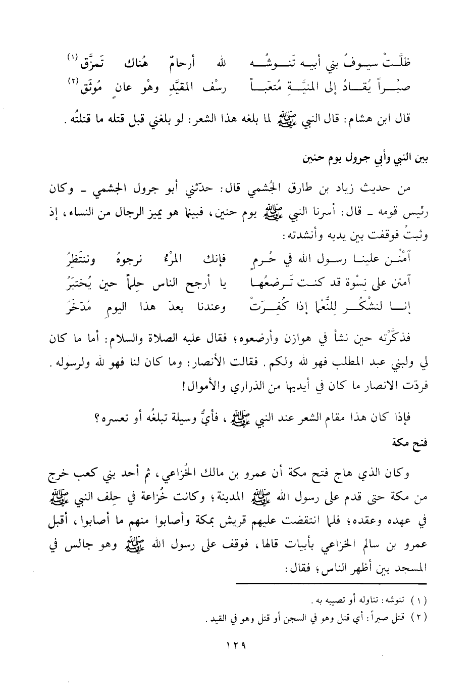 من حديث زياد بن طارق الجشمي قال: حدّثني أبو جرول الجشمي- وكان رئيس قومه- قال: أسرنا النبي صلّى الله عليه وسلّم يوم حنين، فبينما هو يميز الرجال من النساء، إذ وثبت فوقفت بين يديه وأنشدته: