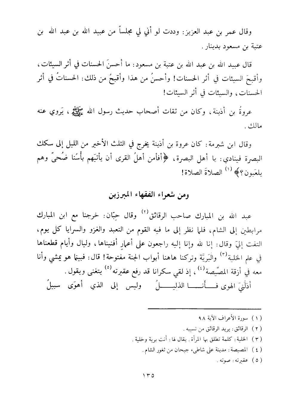 قال عبيد الله بن عبد الله بن عتبة بن مسعود: ما أحسن الحسنات في أثر السيئات، وأقبح السيئات في أثر الحسنات! وأحسن من هذا وأقبح من ذلك: الحسنات في أثر الحسنات، والسيئات في أثر السيئات! عروة بن أذينة، وكان من ثقات أصحاب حديث رسول الله صلّى الله عليه وسلم، يروي عنه مالك.