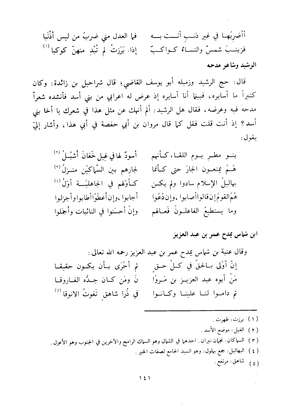 قال: حج الرشيد وزميله أبو يوسف القاضي، قال شراحيل بن زائدة: وكان كثيرا ما أسايره، فبينما أنا أسايره إذ عرض له اعرابي من بني أسد فأنشده شعرا مدحه فيه وعرضه، فقال هل الرشيد: ألم أنهك عن مثل هذا في شعرك يا أخا بني أسد؟ إذ أنت قلت فقل كما قال مروان بن أبي حفصة في أبي هذا، وأشار إليّ يقول: