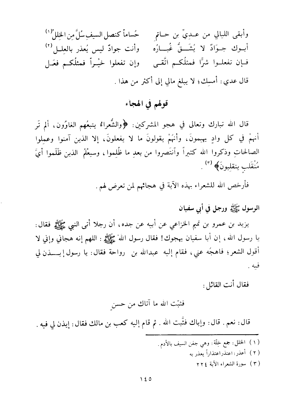 قال الله تبارك وتعالى في هجو المشركين: وَالشُّعَراءُ يَتَّبِعُهُمُ الْغاوُونَ، أَلَمْ تَرَ أَنَّهُمْ فِي كُلِّ وادٍ يَهِيمُونَ، وَأَنَّهُمْ يَقُولُونَ ما لا يَفْعَلُونَ، إِلَّا الَّذِينَ آمَنُوا وَعَمِلُوا الصَّالِحاتِ وَذَكَرُوا اللَّهَ كَثِيراً وَانْتَصَرُوا مِنْ بَعْدِ ما ظُلِمُوا، وَسَيَعْلَمُ الَّذِينَ ظَلَمُوا أَيَّ مُنْقَلَبٍ يَنْقَلِبُونَ