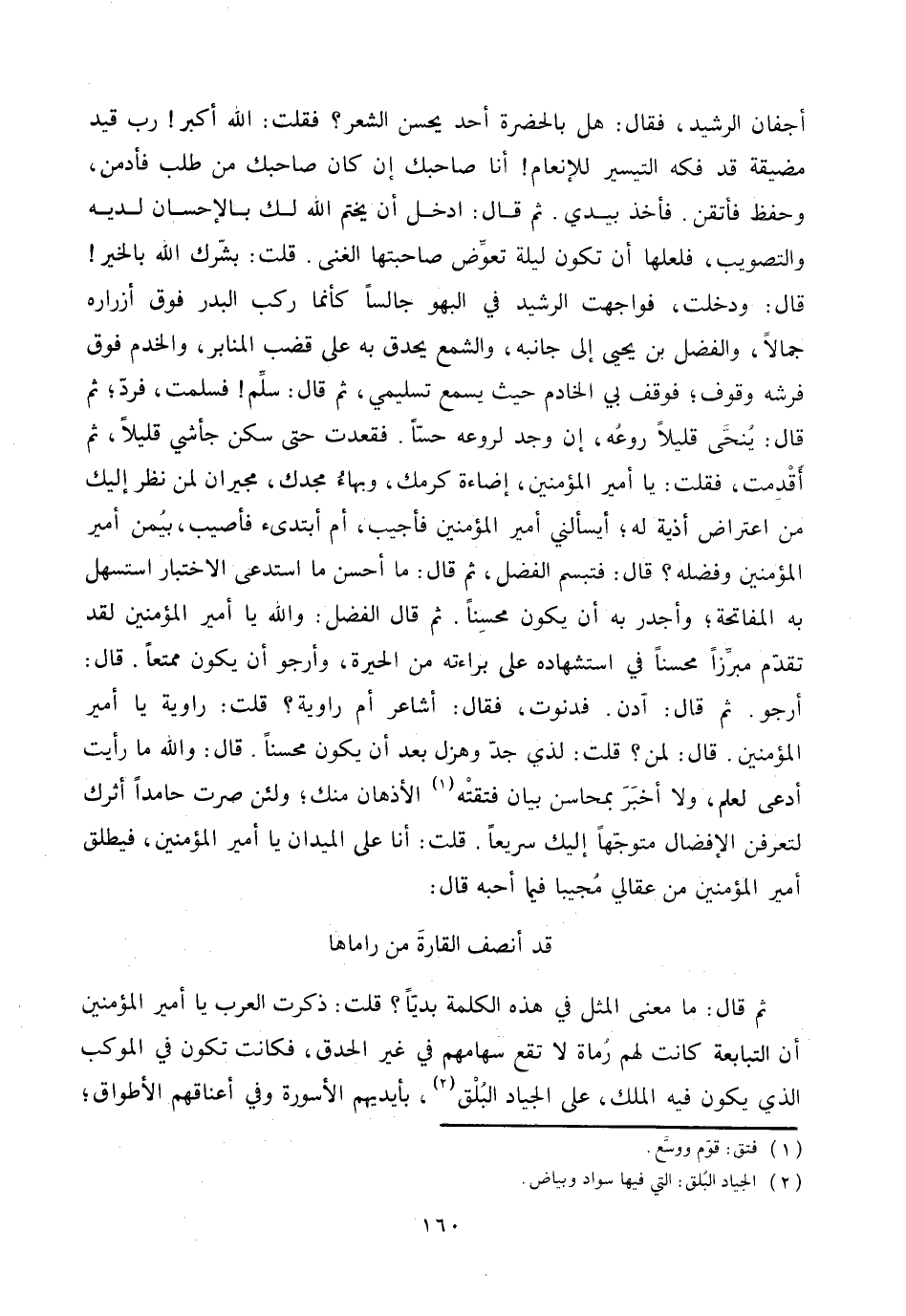 أرجو. ثم قال: ادن. فدنوت، فقال: أشاعر أم راوية؟ قلت: راوية يا أمير المؤمنين. قال: لمن؟ قلت: لذي جدّ وهزل بعد أن يكون محسنا. قال: والله ما رأيت أدعى لعلم، ولا أخبر بمحاسن بيان فتقته «1» الأذهان منك، ولئن صرت حامدا أثرك لتعرفن الإفضال متوجّها إليك سريعا. قلت: أنا على الميدان يا أمير المؤمنين، فيطلق أمير المؤمنين من عقالي مجيبا فيما أحبه قال: