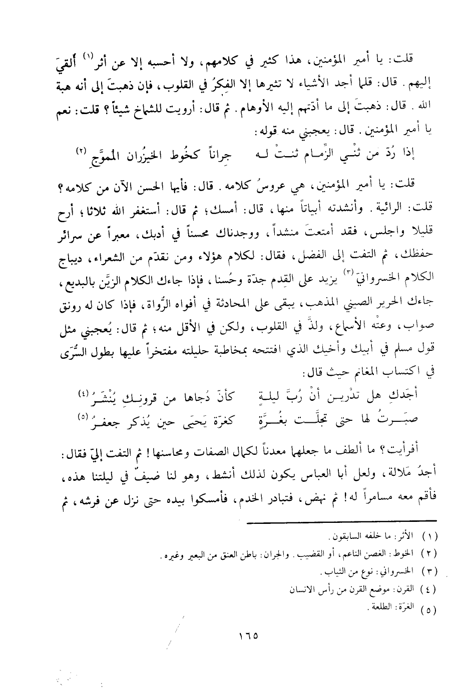 قلت: الرائية. وأنشدته أبياتا منها، قال: أمسك، ثم قال: أستغفر الله ثلاثا، أرح قليلا واجلس، فقد أمتعت منشدا، ووجدناك محسنا في أدبك، معبرا عن سرائر حفظك، ثم التفت إلى الفضل، فقال: لكلام هؤلاء ومن نقدّم من الشعراء، ديباج الكلام الخسروانيّ «3» يزيد على القدم جدّة وحسنا، فإذا جاءك الكلام الزيّن بالبديع، جاءك الحرير الصيني المذهب، يبقى على المحادثة في أفواه الرّواة، فإذا كان له رونق صواب، وعته الأسماع، ولذّ في القلوب، ولكن في الأقل منه، ثم قال: يعجبني مثل قول مسلم في أبيك وأخيك الذي افتتحه بمخاطبة حليلته مفتخرا عليها بطول السّرى في اكتساب المغانم حيث قال: