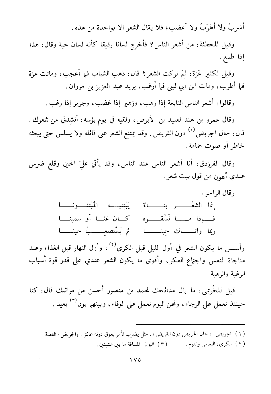 وأسلس ما يكون الشعر في أول الليل قبل الكرى «2» ، وأول النهار قبل الغذاء وعند مناجاة النفس واجتماع الفكر، وأقوى ما يكون الشعر عندي على قدر قوة أسباب الرغبة والرهبة.