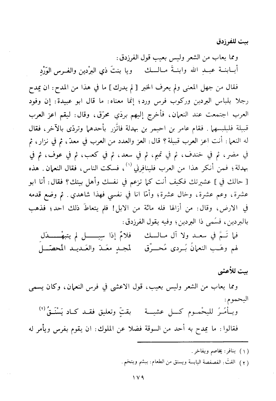 فقال من جهل المعنى ولم يعرف الخبر [لم يدرك] ما في هذا من المدح: ان يمدح رجلا بلباس البردين وركوب فرس ورد، إنما معناه: ما قال ابو عبيدة: إن وفود العرب اجتمعت عند النعمان، فأخرج إليهم بردي محرّق، وقال: ليقم اعز العرب قبيلة فليلبسهما. فقام عامر بن احيمر بن بهدلة فاتّزر بأحدهما وتردّى بالآخر، فقال له النعما: أنت اعز العرب قبيلة؟ قال: العز والعدد من العرب في معدّ، ثم في نزار، ثم في مضر، ثم في خندف، ثم في تميم، ثم في سعد، ثم في كعب، ثم في عوف، ثم في بهدلة، فمن أنكر هذا من العرب فلينافرني «1» ، فسكت الناس، فقال النعمان. هذه [حالك في] عشيرتك فكيف أنت كما تزعم في نفسك وأهل بيتك؟ فقال: أنا ابو عشرة، وعم عشرة، وخال عشرة، وأمّا انا في نفسي فهذا شاهدي. ثم وضع قدمه في الارض، وقال: من أزالها فله مائة من الابل! فلم يتعاط ذلك احد، فذهب بالبردين، فسمى ذا البردين، وفيه يقول الفرزدق: