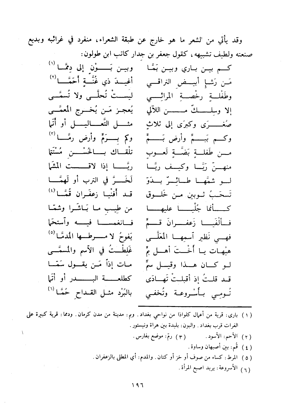 وقد يأتي من الشعر ما هو خارج عن طبقة الشعراء، منفرد في غرائبه وبديع صنعته ولطيف تشبيهه، كقول جعفر بن جدار كاتب ابن طولون: