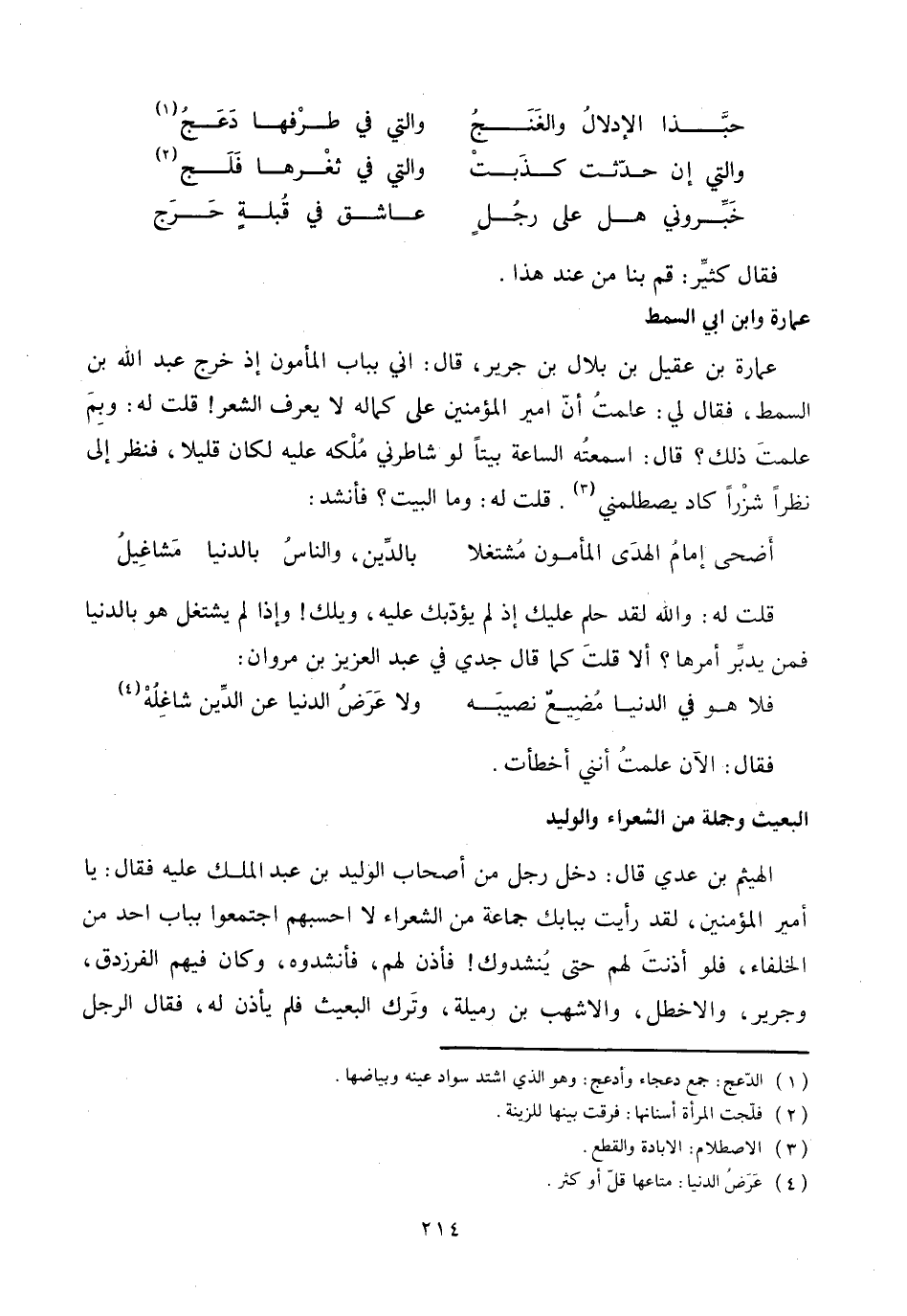 عمارة بن عقيل بن بلال بن جرير، قال: اني بباب المأمون إذ خرج عبد الله بن السمط، فقال لي: علمت أنّ امير المؤمنين على كماله لا يعرف الشعر! قلت له: وبم علمت ذلك؟ قال: اسمعته الساعة بيتا لو شاطرني ملكه عليه لكان قليلا، فنظر إلى نظرا شزرا كاد يصطلمني «3» . قلت له: وما البيت؟ فأنشد: