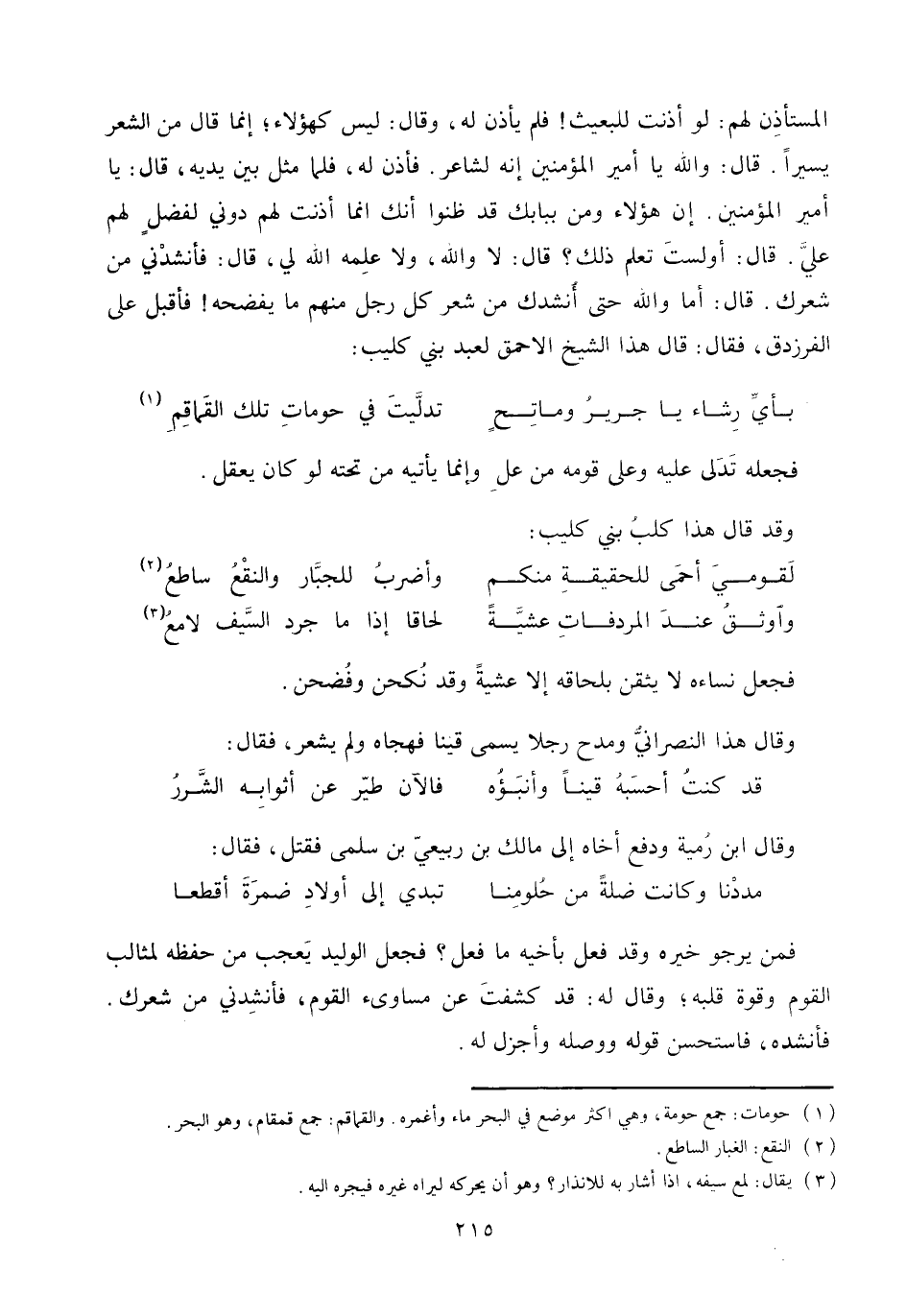 المستأذن لهم: لو أذنت للبعيث! فلم يأذن له، وقال: ليس كهؤلاء، إنما قال من الشعر يسيرا. قال: والله يا أمير المؤمنين إنه لشاعر. فأذن له، فلما مثل بين يديه، قال: يا أمير المؤمنين. إن هؤلاء ومن ببابك قد ظنوا أنك انما أذنت لهم دوني لفضل لهم عليّ. قال: أولست تعلم ذلك؟ قال: لا والله، ولا علمه الله لي، قال: فأنشدني من شعرك. قال: أما والله حتى أنشدك من شعر كل رجل منهم ما يفضحه! فأقبل على الفرزدق، فقال: قال هذا الشيخ الاحمق لعبد بني كليب: